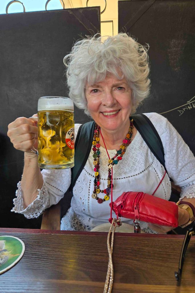 A little after eight, it was time for the Grand Meet up party on the aft deck and I understood why the ships were butt to butt. It was like one big party, only we each only had access to one side of the “room”. I met up with Ginny Stibolt, right away. I have known her since 2012. She’s a HAL speaker now, an authority on all things horticultural. I know she’s good, I get her blog. I saw a few other faces I recognized, but had never been friends with, and then I ran into Rosita, who, with her husband Karl, were friends. Then the toasts and such started, ship to ship, and we heard Daniel as well on the Zuiderdam, as if we had been on the Volendam. I am guessing they heard the Zuiderdam cruise director, Kim, too. I was bragging about how good Daniel was, but I couldn’t sell Rosita, who just loved Kim, who she said was the best Cruise Director they ever had. The 2026 World Cruise will be on the Volendam, and Kim will be the Cruise Director. It looks like that will work just fine. The last person I had a chance to chat to, before I turned into a pumpkin, if I didn’t get back to the Volendam, grab my luggage and be off by ten, was Lenora, with whom Nona and I had fun in ports in 2023.