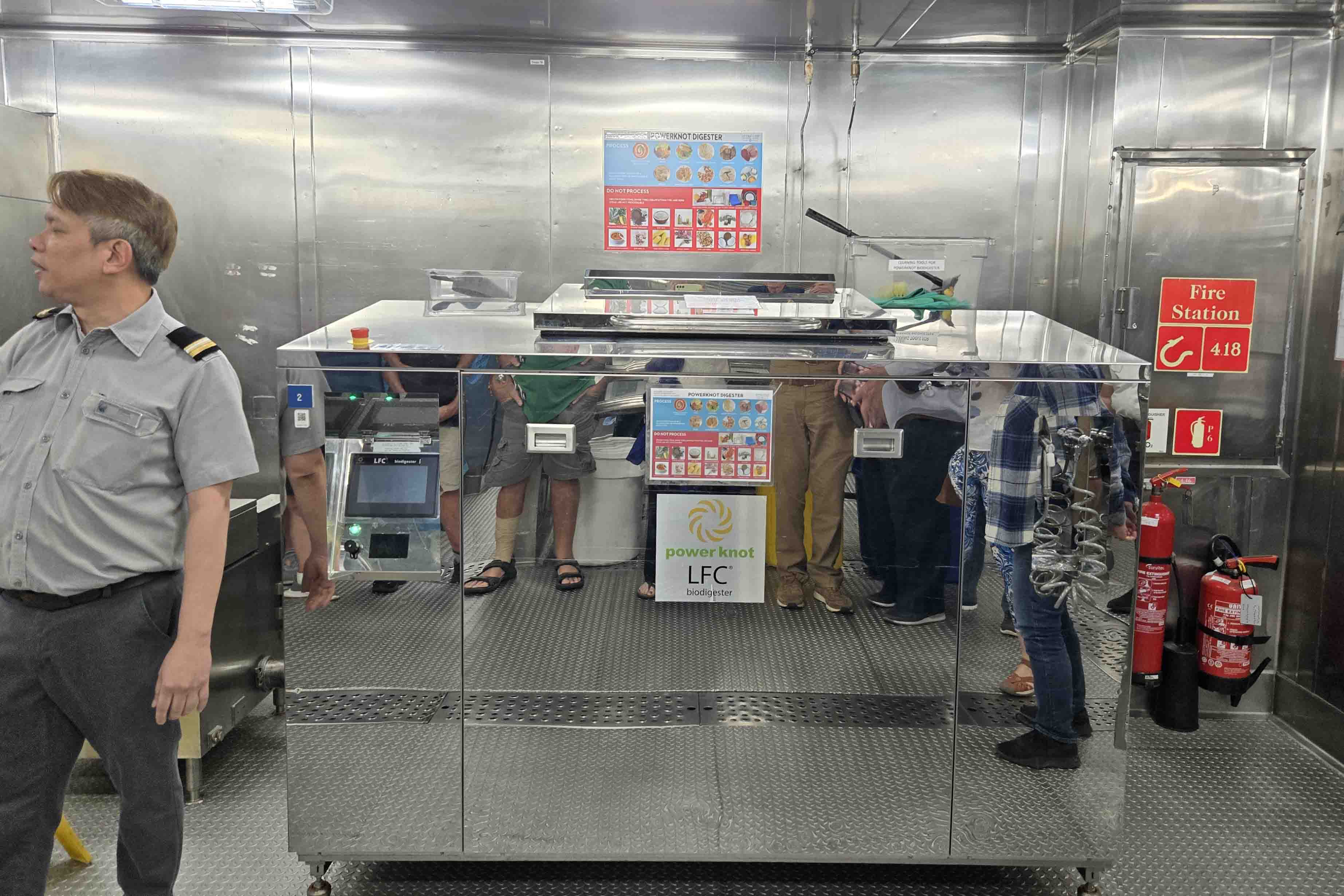 It takes all the food scraps, but the bones, adds only water, and works like a giant stomach, until it turns out something that can be used in power generation. The ship uses a lot of power. Essentially, its diesel engines, just generate electricity and the electricity power everything from the propellers, to the lights, stoves, washing machines, etc. Fun tour.