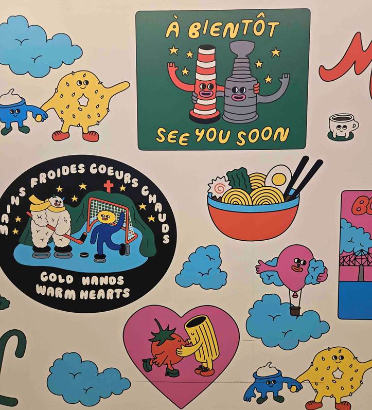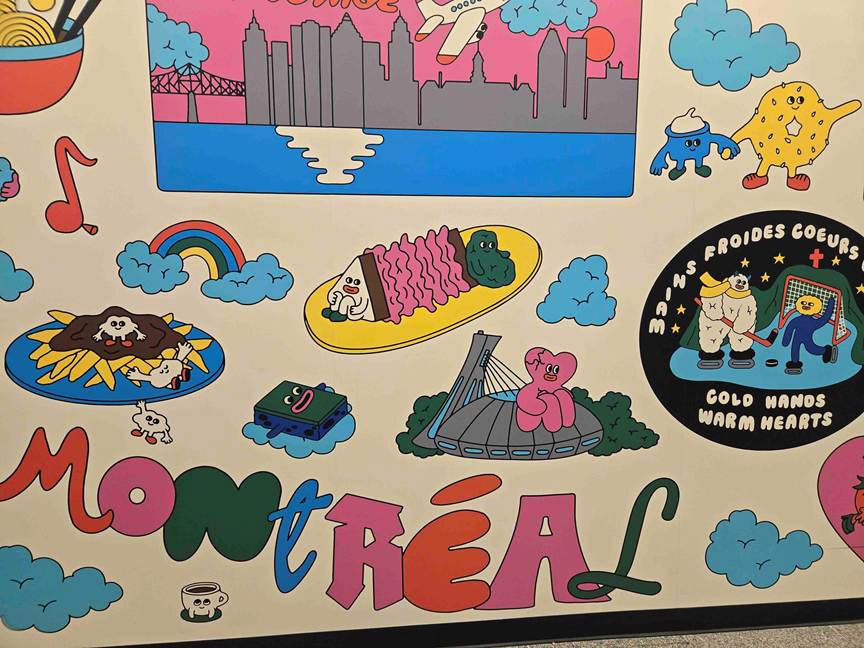 I was up at six, out at seven, and at the airport by 7:30am. There’s construction in the airport, like everywhere else in this city, but I had to give a nod to the mural hiding it. Locals will recognize the construction cone hugging the Stanley Cup. Hockey is the principal religion here, and the cones, well, they are everywhere.