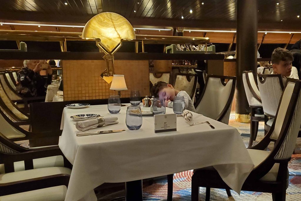 On Dressy night, the food is a cut above, and it was very nice. We were later entertained by a female vocalist in the French style, named Magali Dahan. We enjoyed her and met her again in the Ocean Bar, where Nona and I had a nightcap. This little guy in the Dining Room was just adorable.