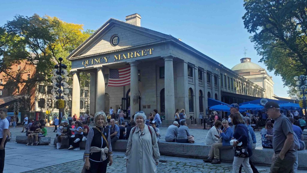 We kept on walking and soon were at Faneuil Hall and Quincy Market, where we met up with Annette and Tim and had a lobster roll and a beer for another $60 each. It was delicious and such a beautiful day that we ate out under those blue umbrellas in the picture. Thus fortified, we walked through Quincy Market, where I let myself be tempted by a scoop of chocolate and a scoop of hazelnut ice cream. The ship wanted us back on board at 3:30, so we walked to the end of the Harbour Bus loop, which was free on the HOHO ticket, and took that one back. It was a very good day in Boston.
