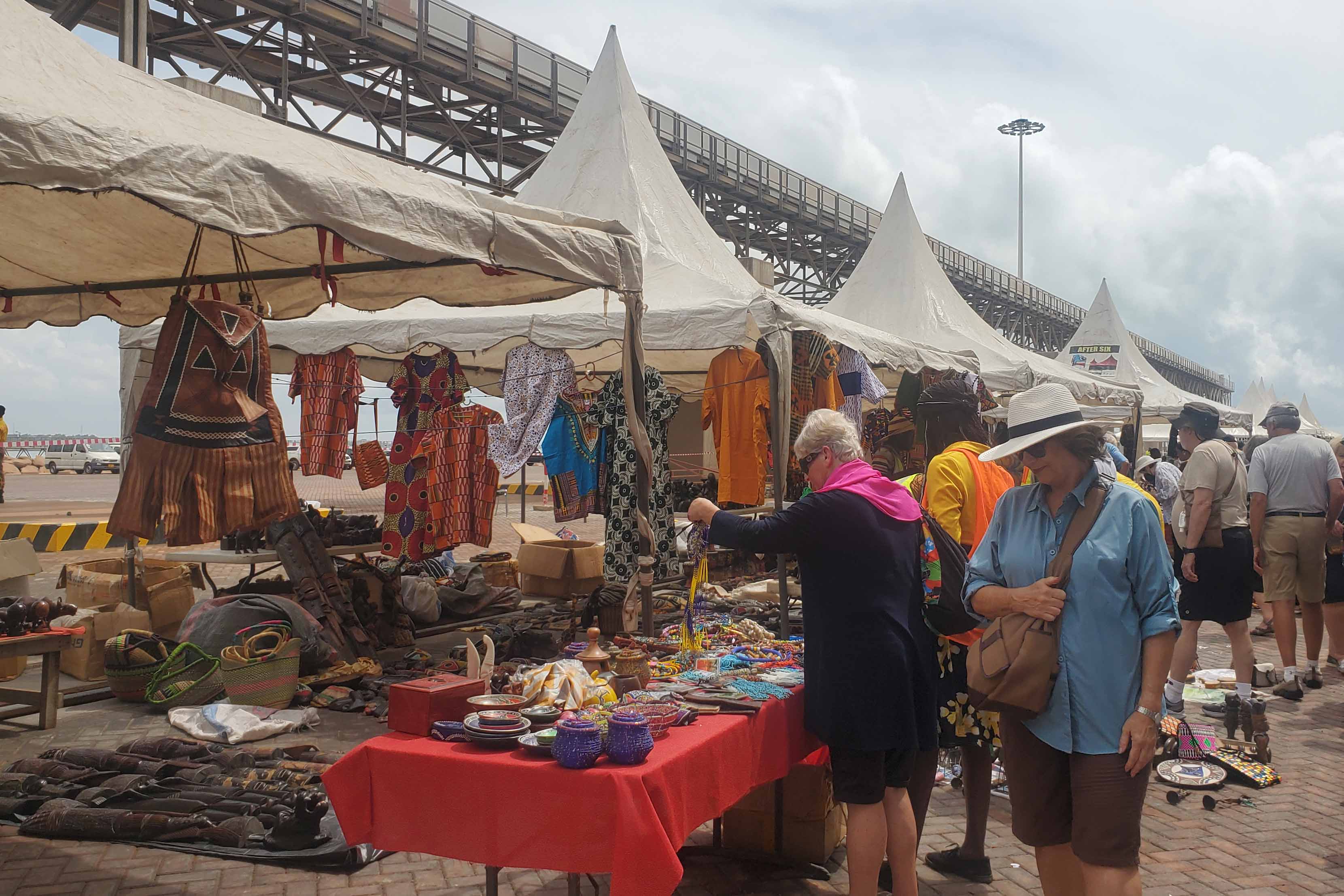 On Sunday, March 26, we docked in Abidjian, Ivory Coast. There was a shuttle to a market in town and Nona and I took it. The big circular market has been torn down and is being totally rebuilt, but there was a smaller one we could access. Ivory Coast is not a very safe place for tourists, so there was a 10-foot-high iron fence around the market. Nona had bought something there in November and the vendor had given her a gift, so she had a gift for the vendor, a little fabric bowl she had made in Arts and Crafts class, filled with Holland America pillow chocolates. Nona had a picture of the vendor to show around and we soon found her. She was delighted with the chocolates and ate all but one of them on the spot. That one she gave to her assistant. They needed to be eaten fast because it was hotter than the melting point of chocolate. There were many hugs and many pictures, but none of them were in my camera.
