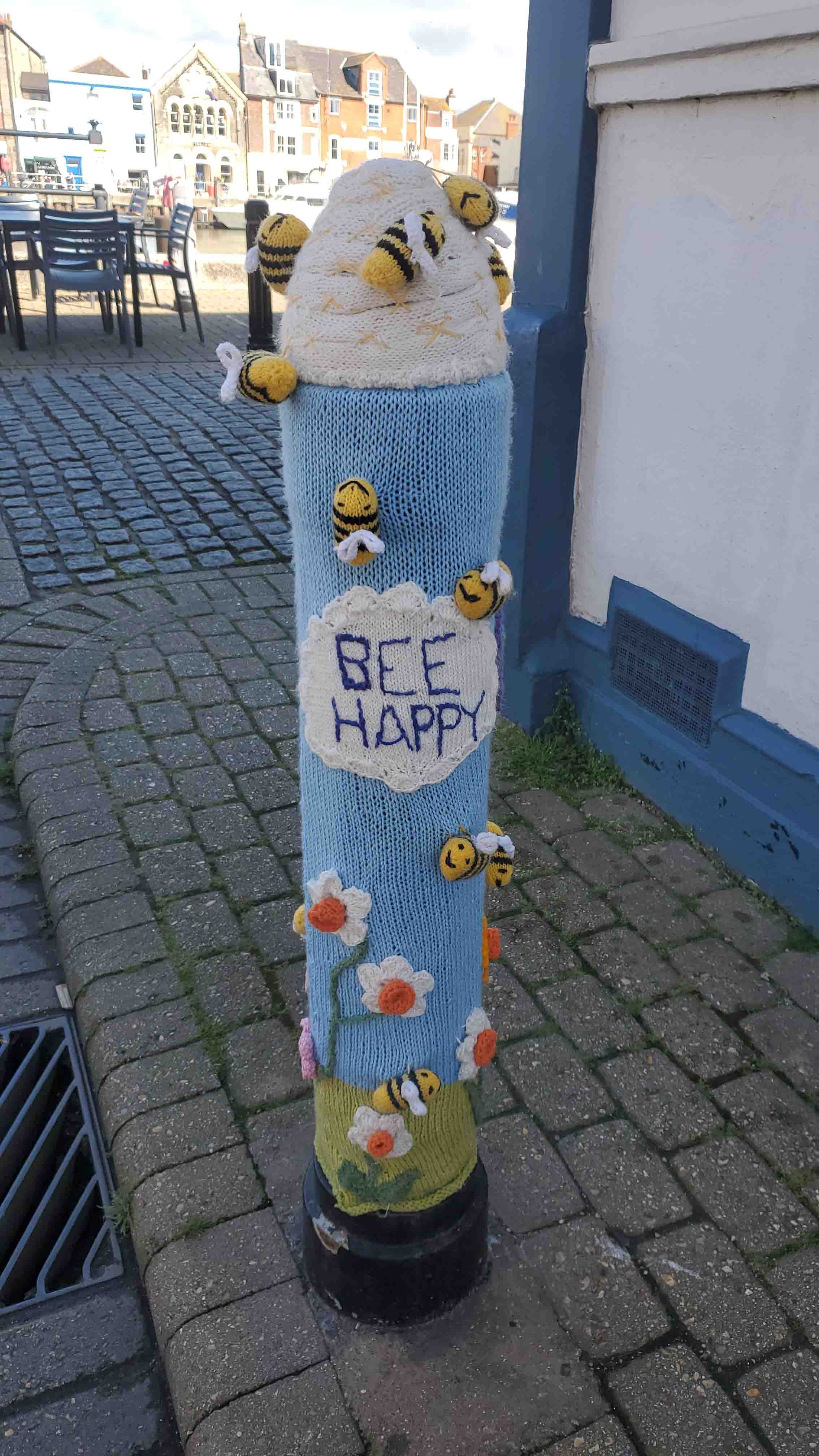 On Saturday, April 15, we were finally in Portland, UK. The weather was a lot better today. Nona and I went out around 10:30am and took the ship’s shuttle into Weymouth. While we were waiting for Wanda and her daughter, Katja, we walked around Weymouth and got some pounds out of an ATM. It’s a cute, touristy little town. We loved these quirky, knitted sweatered, posts.