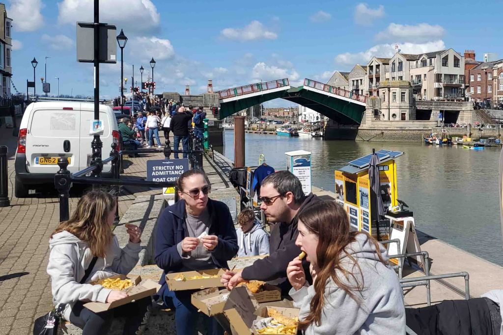 We watched the drawbridge go up, too, and saw other tourists doing what tourists in English seaside towns do. They were having fish ‘n chips from the local Chippie, and did they ever look good: