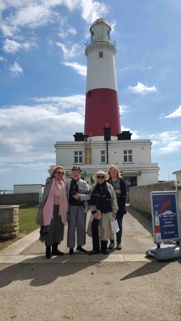 Wanda and Katja arrived at the appointed hour at the appointed spot and off we went on our adventure as “local tourists”. Wanda used to bring the kids over here from Bournemouth for an “outing” when they were young and Katja figured we would like it, too. We did. We went past Chesil Beach, which was very near the ship, and along the rugged coast to Portland Bill lighthouse. There we ate at The Lobster Pot, a local institution. We had crab sandwiches, just like Wanda and the kids used to do, and got ourselves caught up on each others’ lives.
