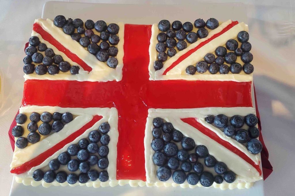 I worked in the morning, when I suppose I should have been watching the Coronation of King Charles III, but I am not in to watching television by myself in my cabin when there’s work to be done, and the ship hadn’t made an event out of it. Seabourn did, I found out from my informer. And one of my fellow hosts did. Tom Mullen, long time Cruise Specialists’ ‘Round the World host, honored a tradition Brits have for such occasions. It’s called “The Big Lunch”. In England and abroad, people hold big, elegant lunches on Coronation Day, and Tom’s was in The Pinnacle. I was honored to be his friend and one of the “Colonials”. There were more decorations there than on the whole rest of the ship, which had none, despite our Cruise Director being British, too. The cake was particularly impressive: