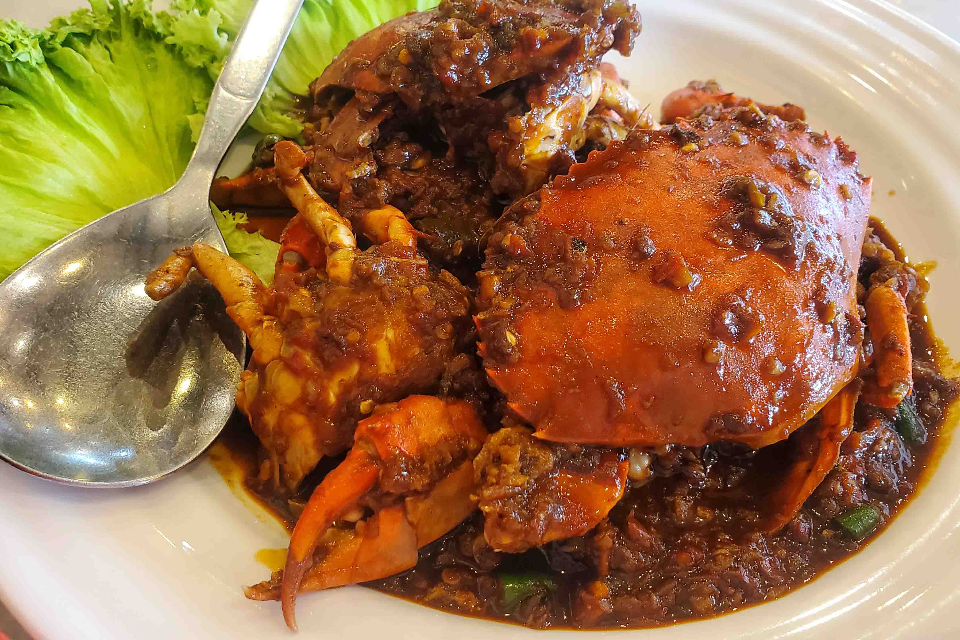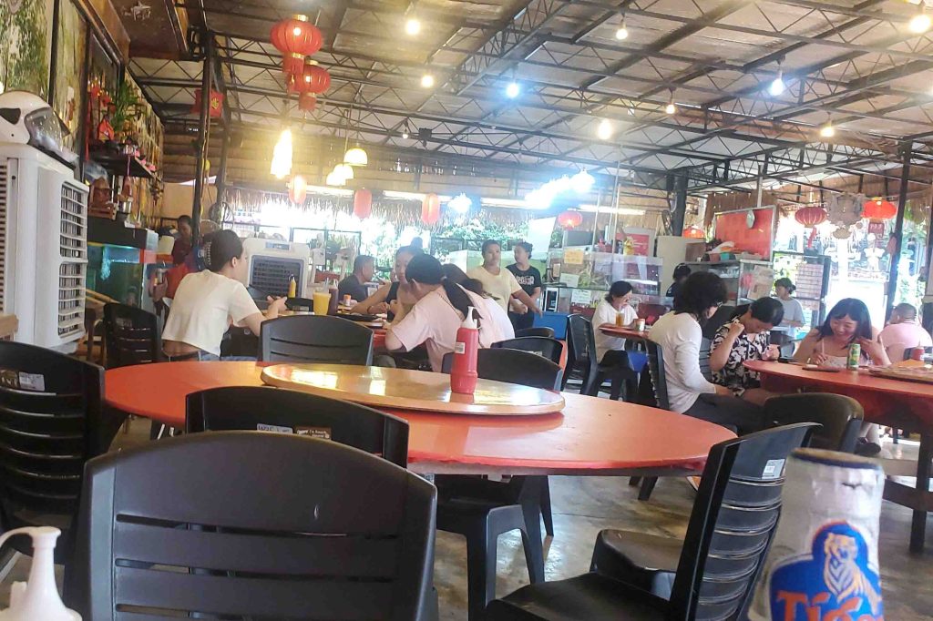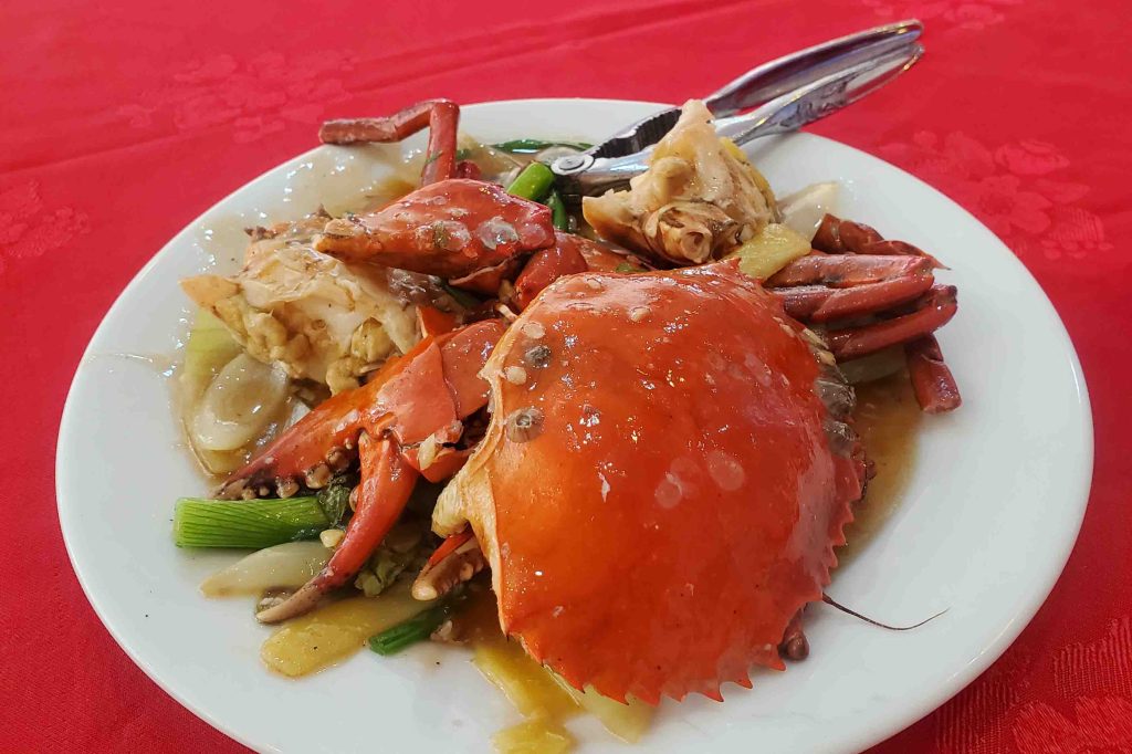 When a half hour passed without anyone coming to me, I asked a few questions and learned the system. I needed to go to the fish tanks, choose my food, while it was still alive, order and pay for it, first. So, I did that. I ordered Chili Crab, Fried Flat Noodles and Ginger and Spring Onion Squid.