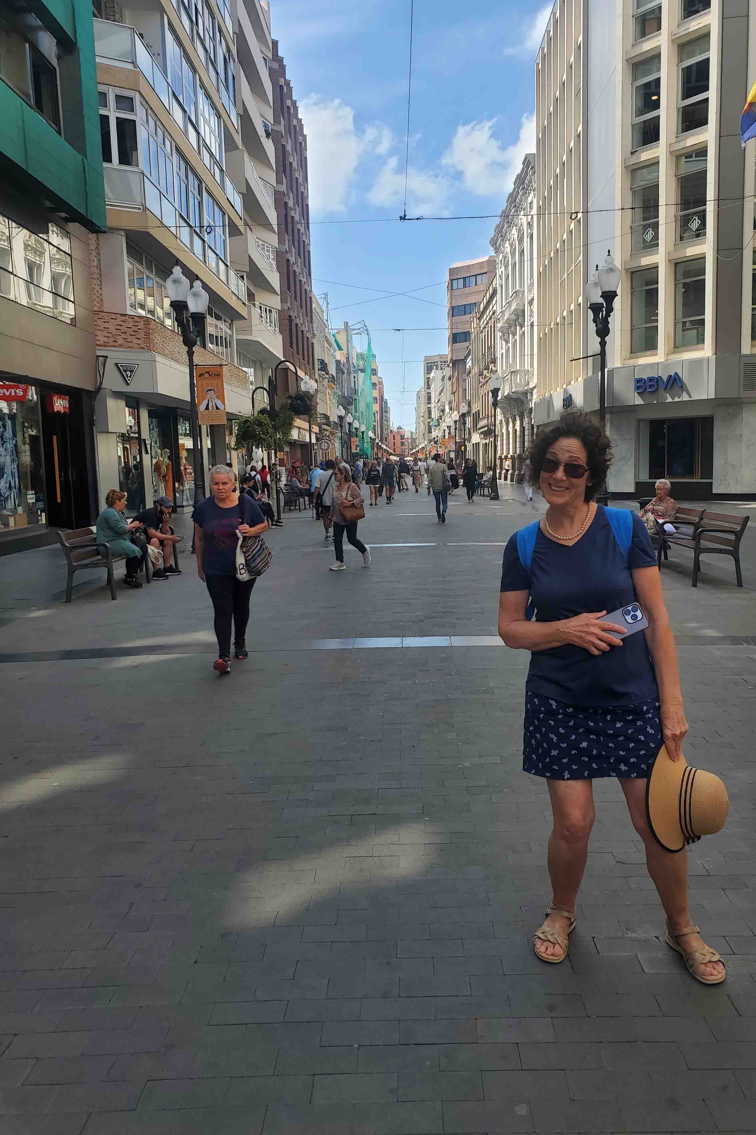 When the bus came, it was pretty crowded, but my white hair got me a seat, and a flirt got a conversation opened with a nice young local woman, who is studying to be a vet. I told her about our plan and she had a way to improve on it. We were to get off with her and she would show us to the top of a walking street that we could walk down into the old town. That was perfect. Here’s Liz at the top of said mall, happy as a clam: