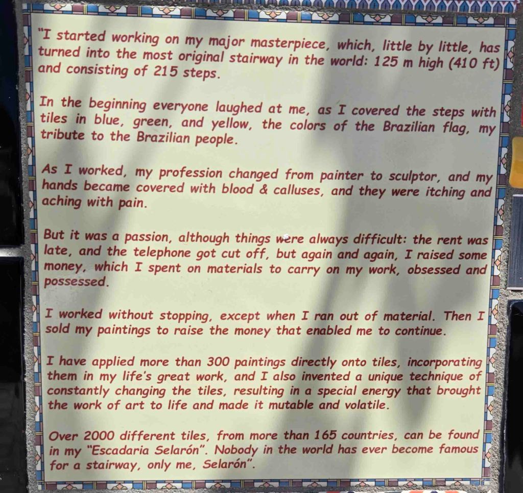 There are a bunch of Holland America tiles in this version, and in the original, as the idea caught on and a number of passengers, and even HAL itself, donated them. If you are going to Rio, you really need to watch Daniel’s talk, (See below) but here are a few of Selaron’s own words to get you thinking: