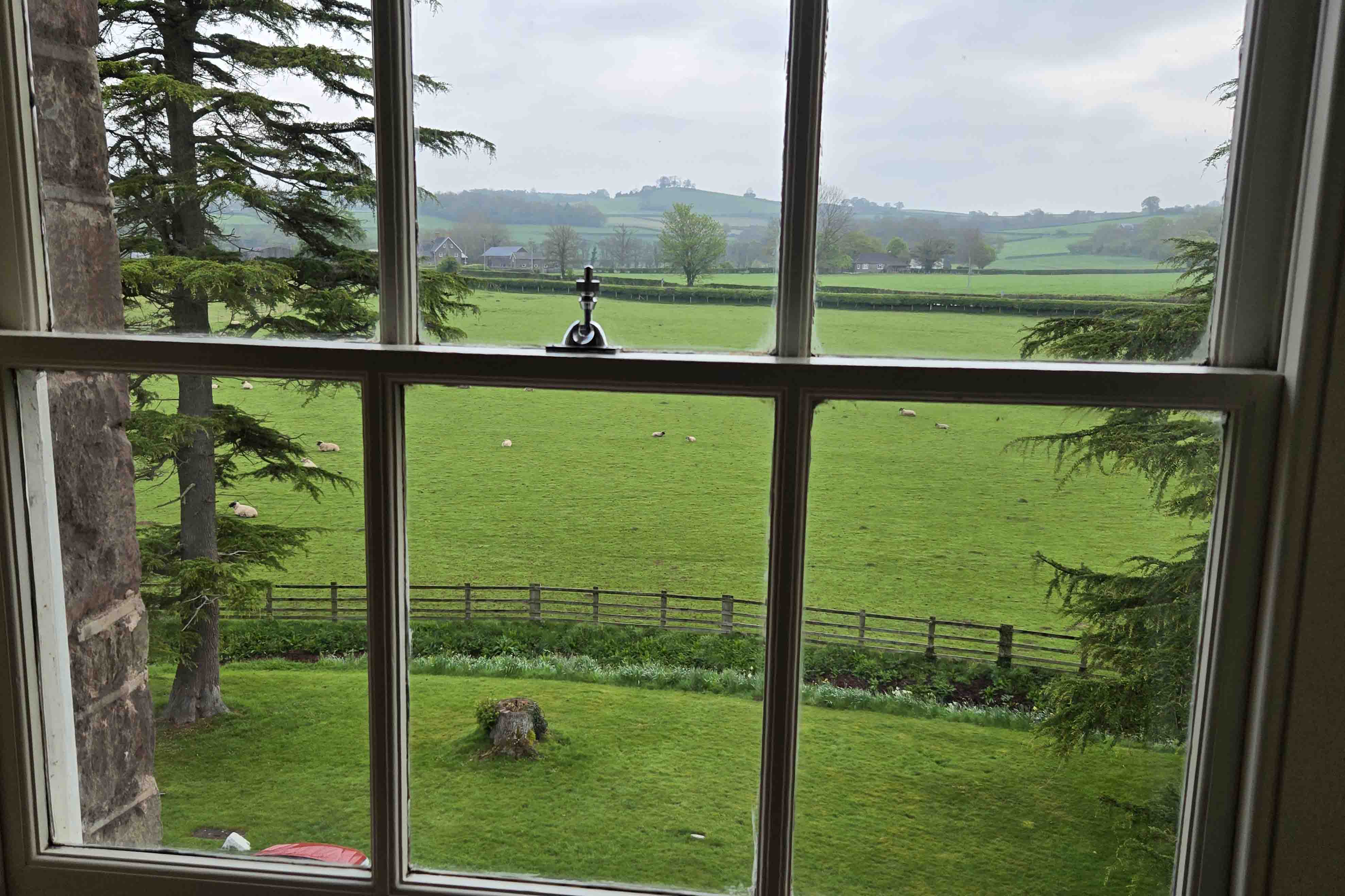 The driver I had booked on line, with the impressive name of Daniel Harper-Jones, was waiting at Cardiff airport and it was a very nice drive, through what had been a ruined landscape, thanks to 300 years of coal mining. The land is slowly returning to pasture, but some of it is still seriously scarred. It does manage to support a lot of sheep and it was lambing season. There’s nothing like fields and fields of lambs to bring a smile to this face, unless it’s the faces of good friends at the end of the journey. They popped over to Peterstone Court, my home for the next three days. We had a little drink together, before I had to make last call to dinner. Supper was very well executed fish and chips, with soda water. What a time not to be drinking, but I had to get control of the tongue thing, and it was time for my annual liver cleanse, anyway.