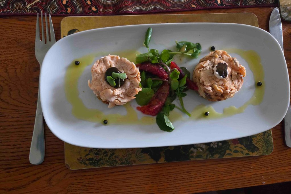 In a very timely fashion, meaning just as I was getting hungry, dinner was served. It was amazing. Local salmon two ways, caught by Andy and served fresh and smoked in his own smoker.