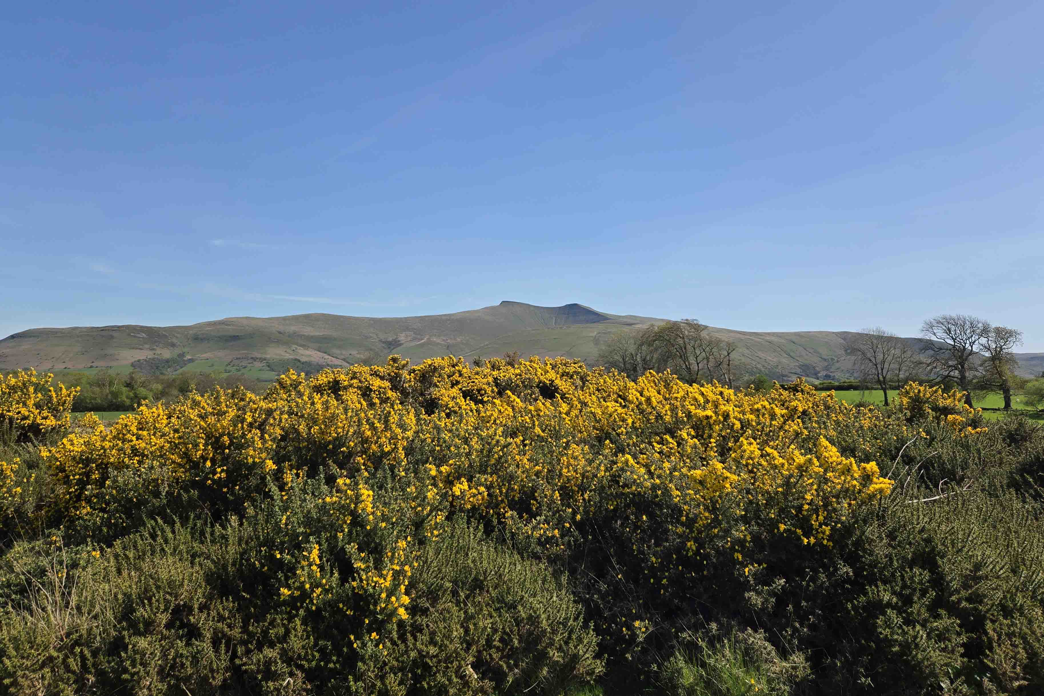 On Sunday, the 27th, after another decadent breakfast and an even more decadent massage, we were off, right into the mountains. It was an even better day, with full sunshine, rare in these parts. I like this picture with the sun on the gorse bushes in the foreground:
