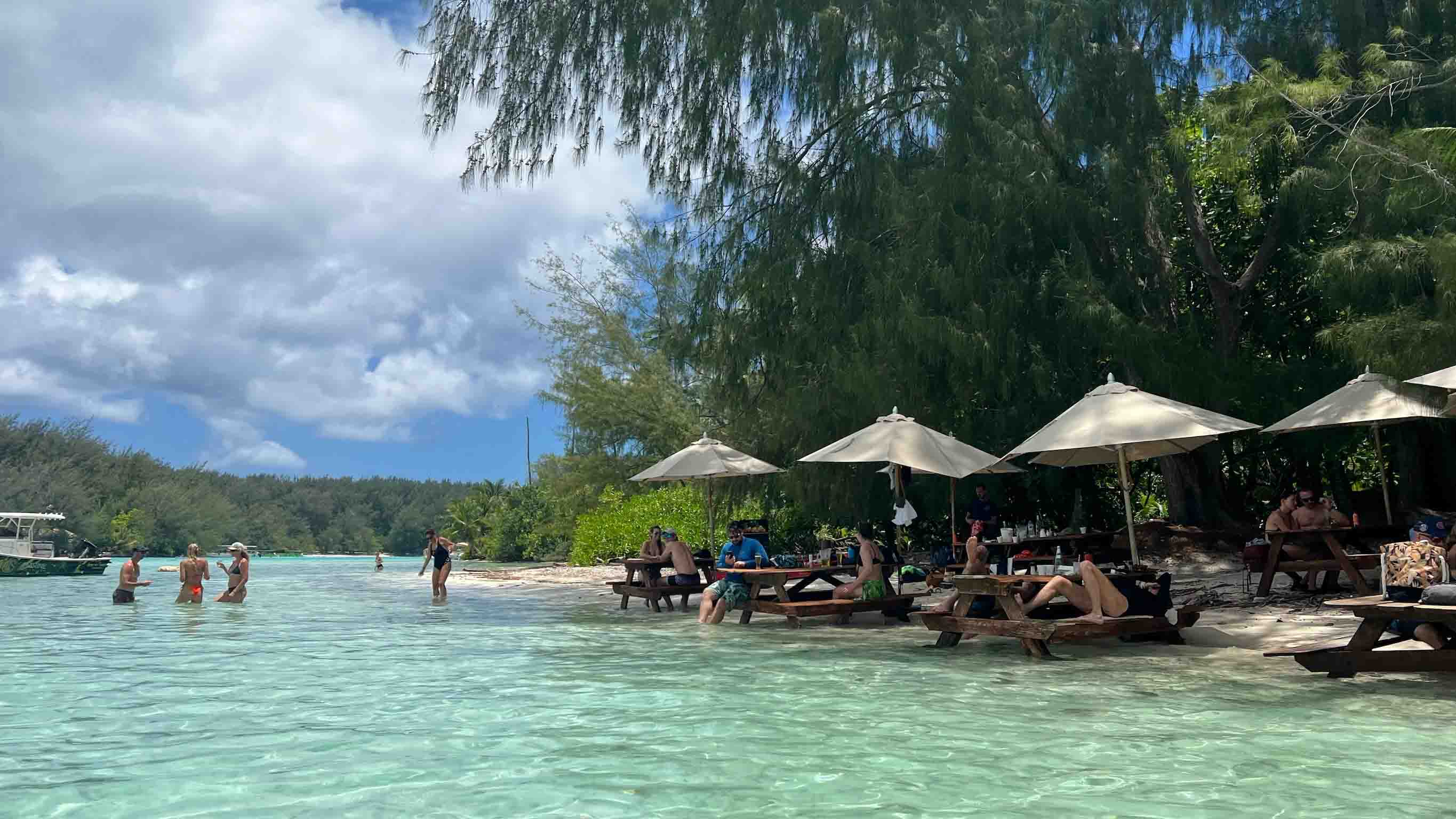 Joanne curated this day off the Internet and it was a pretty good one. There was a free shuttle to a little restaurant on an Island. It was called Coco Beach Restaurant. The shuttle was a van and an outrigger. It was a nice sporty ride to the island and a bit of a surprise when we had to get out in the water and wade to shore. My beach shoes weren’t quite a match for the sharp rocks, but I had help and all was well. The setting was idyllic and the food was very good. Dee had poisson cru marinated in coconut milk, I had tuna tartare with avocado and shared some with Pat because her salad wasn’t the best choice, and Joanne enjoyed a fishburger.