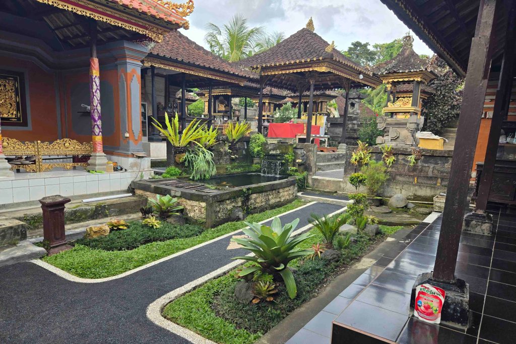 Balinese people live in small houses in big compounds. When a girl marries, she moves out of her family compound and into her husband’s family compound. With any luck, she and her husband acquire a little house therein, so she doesn’t have to live under the same roof as her mother-in-law, but that happens, too. Within the compound, there is commerce, like dyeing, weaving, carving, carpentry, etc. There is also a central temple area, where we were first received: