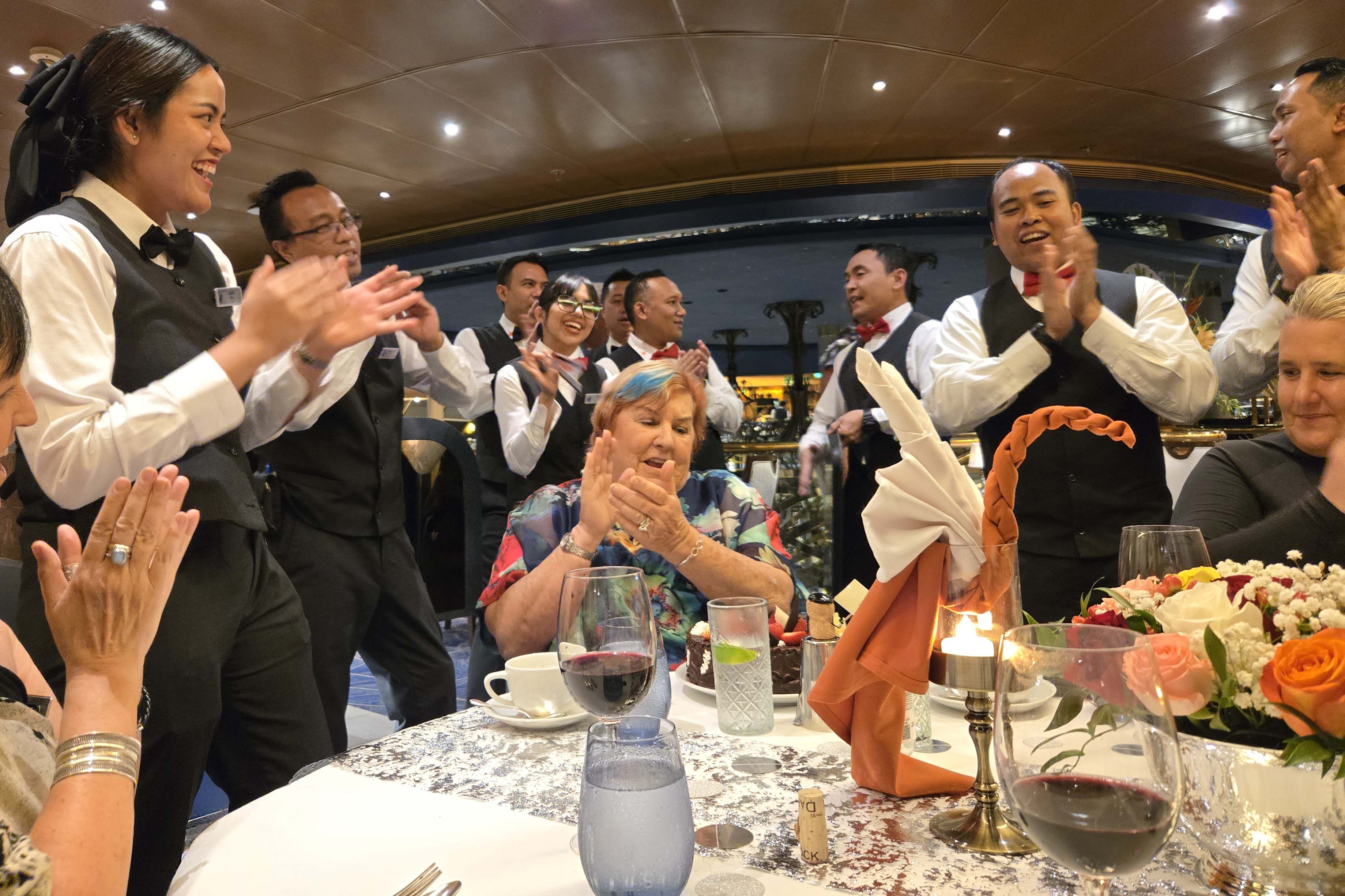 I logged and blogged the day away, until it was time for Wells Wescott’s 89th birthday party. It was a more subdued event this year because Wells was not on board. In past years, it has been dinner for 14 in the Pinnacle, often with the Captain. This year it was our table in the Dining Room, with Josh, the Port Lecturer, and Anne Maree, the Art Teacher.. Anne and Dee had been in touch with Wells and he’s hanging in there and glad we were celebrating his 89th. Panjang Amurnia. Flanking Dee and Anne, are our wonderful Dining Room Stewards, Alice and Amin.