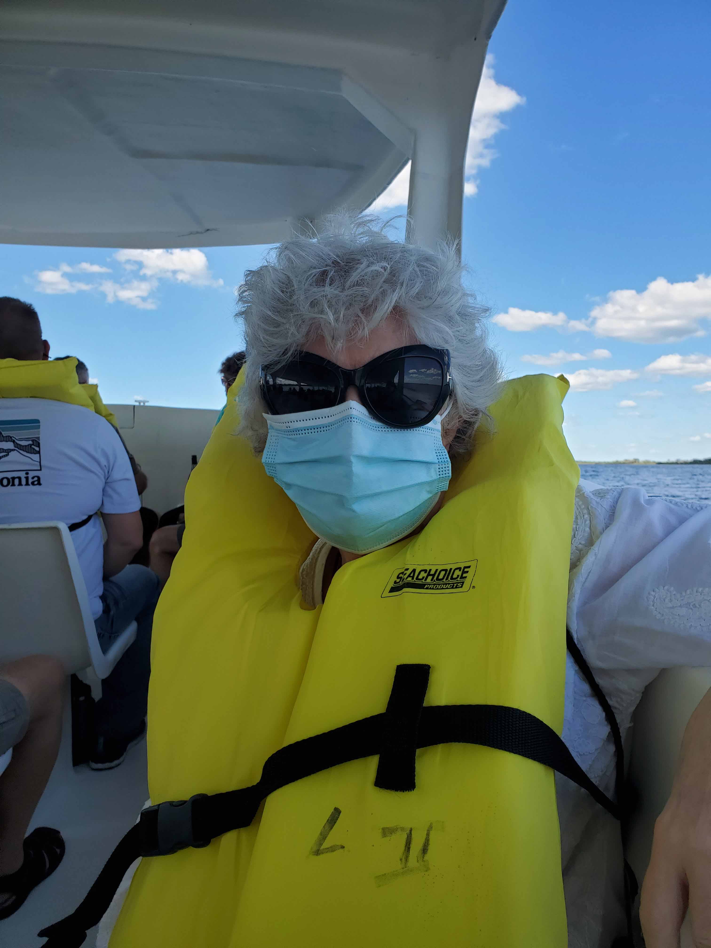 After about an hour of driving through the countryside, we got to a restaurant on a lagoon, for a pit stop, mama bear, and to embark on a motor launch to take us the rest of the way to the Mayan ruins. If there ever was a place we didn’t need masks, this was it, but they are very careful on Belize.