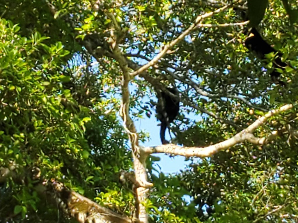 The natives call this the “Jaguar Temple” and if you look closely at the pattern of the holes, you can see why. The temple rises about six times as high as what I have shown, and they don’t let you climb it. It’s too dangerous. That’s OK with me. I didn’t want to climb it anyway. I was much happier to press on to the next one and get a picture of a howler monkey on the way.