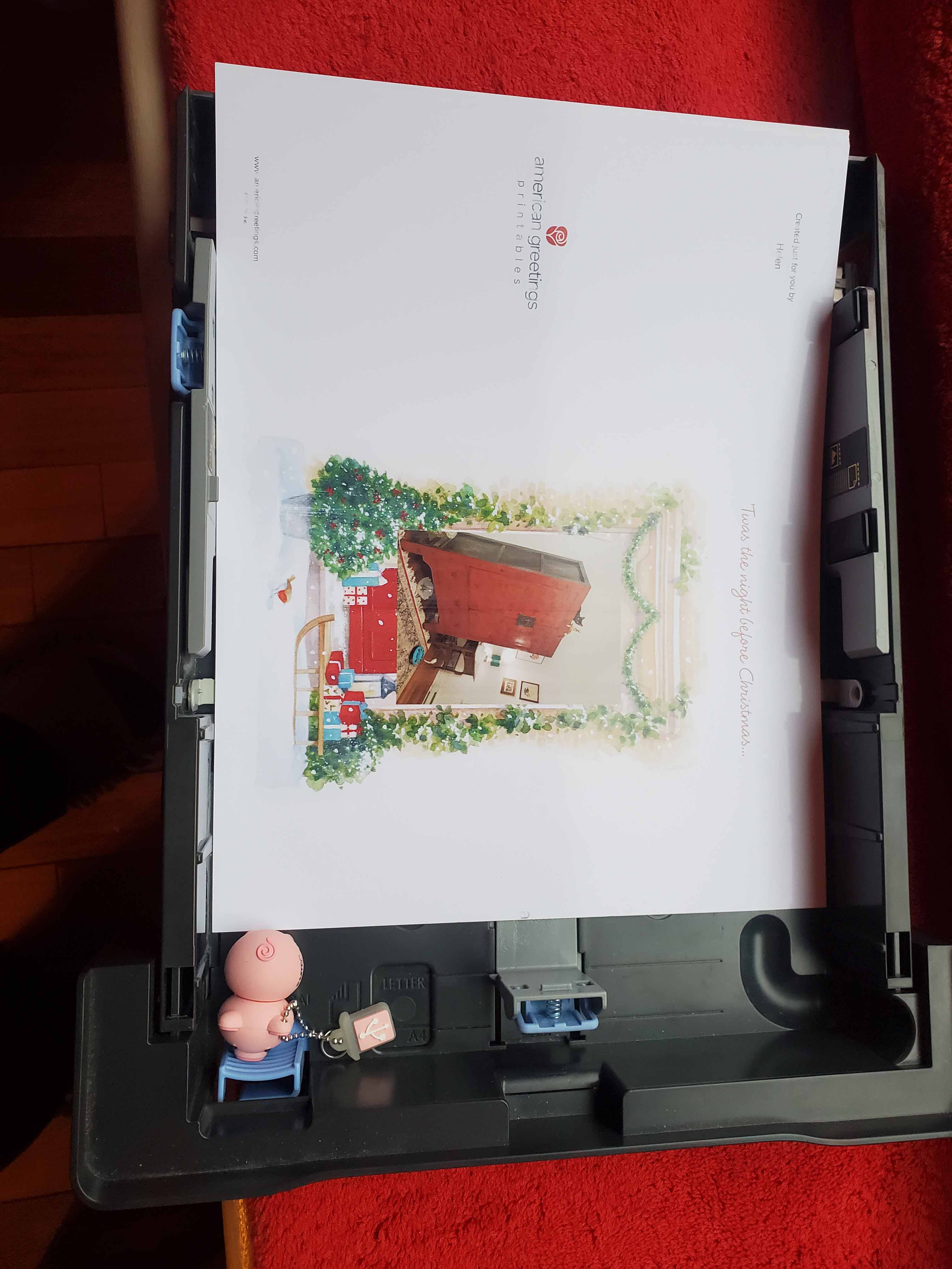 But the sheet feeding mechanism was starting to balk. And the double-sided printing attachment started jamming. I cleaned it as best I could, but it didn’t help much. First every third or fourth card needed attention. Then it went down to every single card and they would have to be printed one side at a time. It’s not intuitively obvious how to feed the second side in. Some of you will notice that when you open your card, you have to turn it right side up to read it. Sorry about that. After a good few balls-ups, I put these little post-its beside the feeder tray.