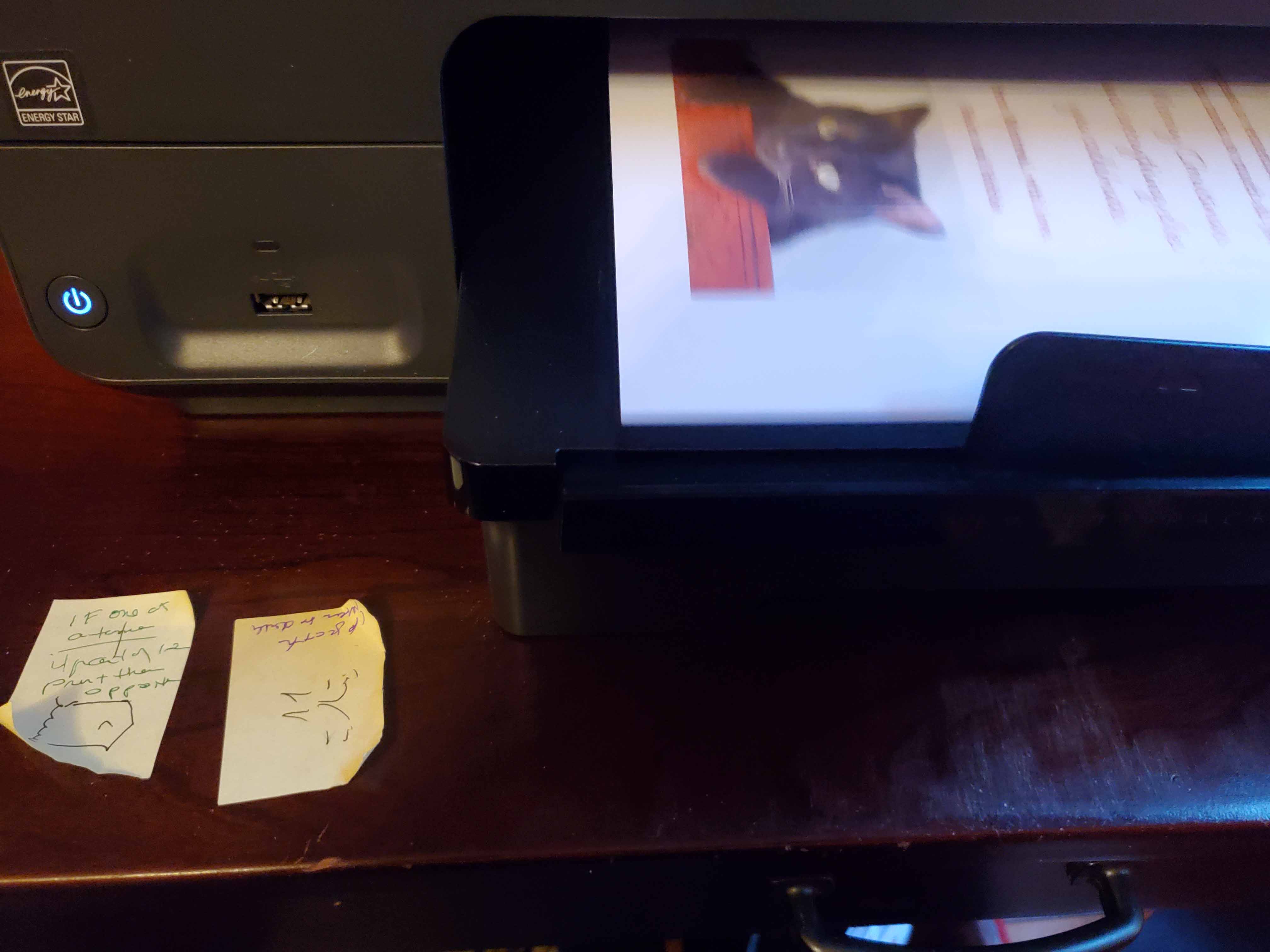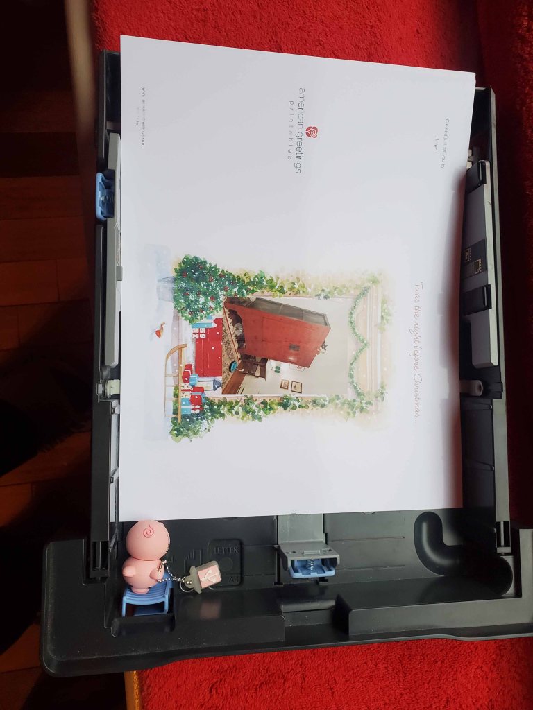 Then I broke the tab that stops the paper from falling on the floor. That’s easy to do when you are hand feeding every page. If you forget and leave it up, but not extended, the card stock tries to feed back into the printer. The mad grab to stop that isn’t pretty. Some of you got cards with evidence of that action on them. In the process, I broke the mechanism, so it doesn’t fold down anymore and is harder to deal with.