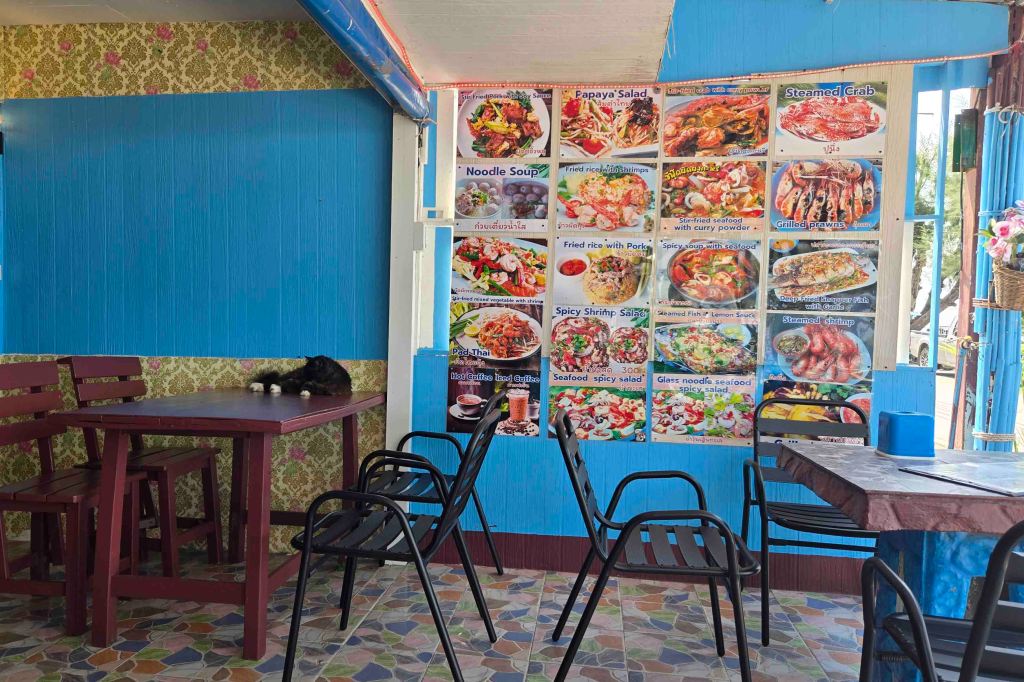 I tapped my VISA card to ride the MRT again and soon was back on board, delivering my first newsletter of the second leg. We were at sea the next day. I like my new desk in the Atrium near Guest Services. I had two visits. One couple are spending a long day in Hong Kong, and have hired a car and driver for the whole day. Good plan. I told them how to use it just like we used our driver35 years ago. They could visit HKMOA on the Kowloon side, check out the Avenue of the Stars on the way to the Star Ferry and meet the driver on the HK side. You get the best pictures from the Star Ferry. They could take one or three rides on it and use their cell phone’s text feature to meet their driver. Linda likes gardens and Zoos and, if it’s a nice day, wants to see the view from the Peak. I recommended lunch in the Clipper Lounge, in the Mandarin, and shopping in the Lanes. They will have a wonderful day and sleep well on the plane home. Stuart Gustafson stopped by, to sign up for dinner on the 7th. It turns out he is “America’s International Travel Expert®” and has spoken on the Main Stages of a lot of ships. I’m guessing that means he’s good, and set him up as a Distinctive Speaker. While I was at it, I booked two time slots in the Hudson room and will see who else we have. At 6:00, I went up to the Crow’s Nest, as promised, and ended up in the singles’ gathering with two of my people, Elmina Davis and Lorraine Aitkin. They had had dinner at five, so I went to dinner with a couple of other singles and spent some time in Billboard Onboard with pianists Megan and Gabe. On Monday, February 3, we docked in Koh Samui, Thailand. I have fond memories of a Koh Samui vacation in 1990, with Carolyn Eyster and Theresa Benedek, who visited Hong Kong for a couple of weeks. We rented a hut right on the beach and had a wonderful time. Those were the days. It’s not all that much fun doing beach time when you are alone, and verging on decrepit, so I decided to be a food tourist in town. We had shore tenders that day and they were pretty elegant, with turned wood and open sides. It was a very pleasant ride. Once on shore, I got a map which indicated where there was a concentration of restaurants, facing the ocean, so I headed there. I walked along the restaurant fronts, taking note of what they were serving, getting some exercise and making my choice. I should have left more time for a massage. That wasn’t so clever, but I had got a good bit of work done and that relaxes me as much as a massage. I liked the look of this restaurant, and it’s sole occupant.