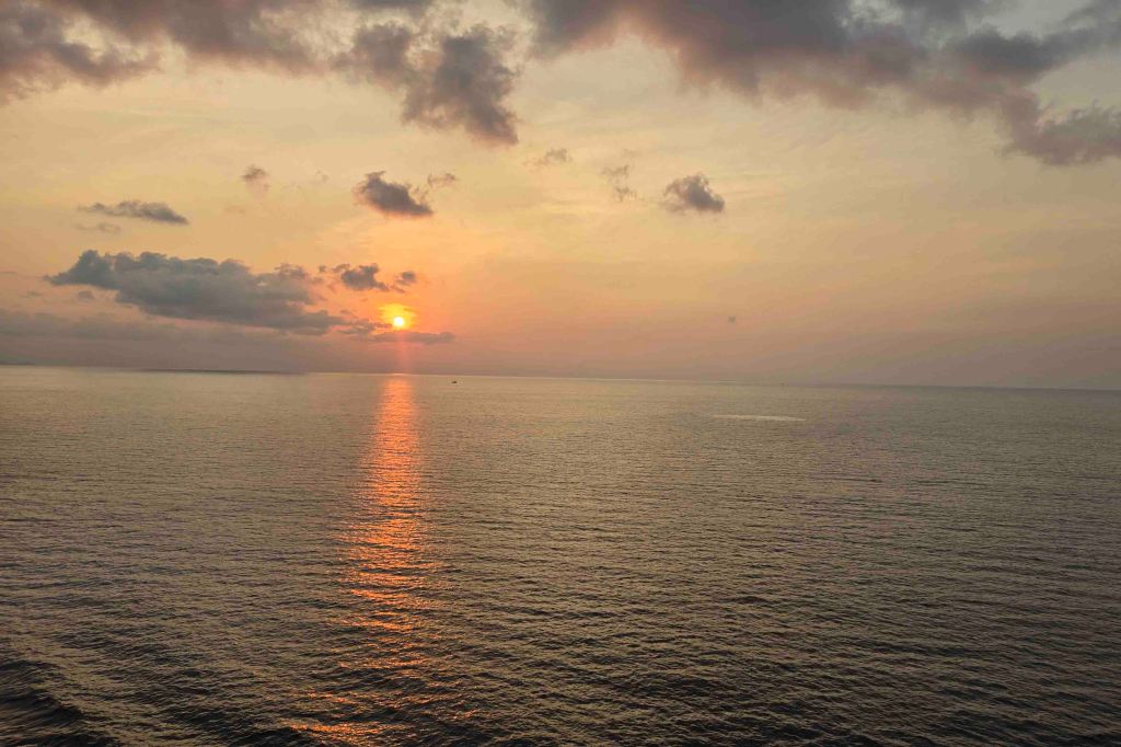 We had a quick lunch at a suckling pig restaurant, where they were out of the delicious skin, but managed to serve us something different and fascinating anyway. We were in a hurry because of all the time lost in traffic, and the need to get in another meal before all-aboard at 9:30pm. Some of us were more stressed than others. I trusted Made, but no one else had that experience. Our shopping stop was curtailed, too, resulting in the purchase of a top that could only be described as a minimizer. I’ll be leaving that on board. Surely one of my stewards has a wife who can fit into it, as it does me no favors. I don’t mind. I like to support the local economy, and, traveling in carry-on, I expect to buy and leave along the way, like the threadbare nightshirt, which will stay in HK, and doubtless be cut into rags. We had four wusses, who wanted to be dropped off at the ship for dinner, for the food, the local show onboard, and not to have to worry about the time. The seven of us, including Made and Devi, continued on to one of the times of our lives. Made took us to Jimbaran Beach, where the sun sets, and the beach is lined with restaurants, to take advantage of it. We ate at a place called the Sea Side Café at a table right on the beach, with the setting sun:
