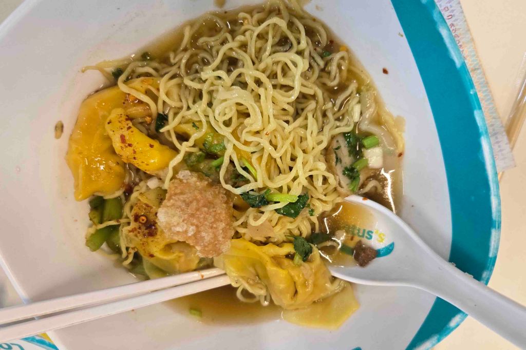 Tuesday, February 4, we docked in Laem Chabang (Bangkok), Thailand. If it weren’t so polluted, I could spend a couple of weeks in Bangkok, but there’s nothing more for me to see in a day and it’s not worth the two and a half-hour bus ride in and out to see the same temples again. I got more work done and took the free shuttle in to the mall in Laem Chabang. My stewards had told me to eat at the street food stands outside the mall and that was my plan, but there was no seating out there. The mall, itself, was pretty pathetic, but it was clean as a whistle, and that includes the bathrooms. It had a food court, too, so I decided to check that out. A nice little old Thai man, with a bit of English, volunteered to help me. I ended up with: