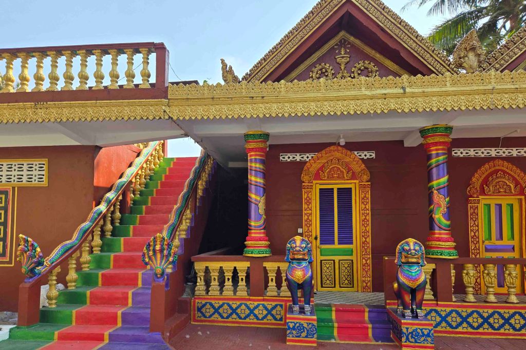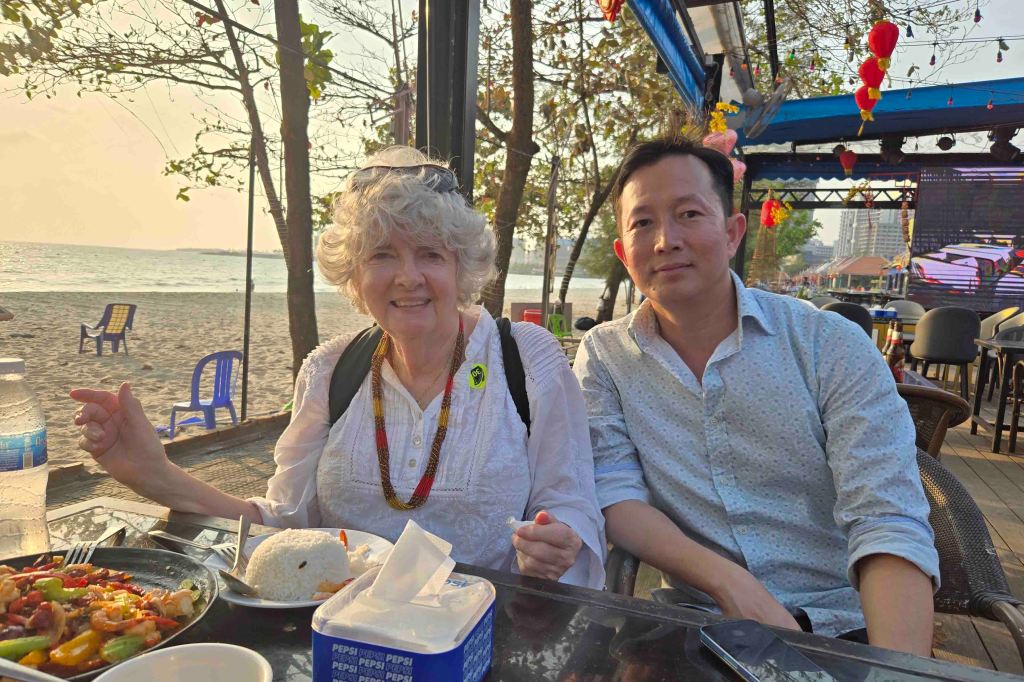 And it was all delicious. I hit the Swensen’s for a “sticky, chewy chocolate” ice cream cone and was a happy tourist. We had a second day in Laem Chabang. All I did on shore was change money. I had taken out too many Thai Baht. I need Vietnamese Dong. That done, I re-boarded and delivered my newsletters. Then I went to dinner and saw Michelle Montuori on the World stage. I had last seen her on Oceania in ’22 with Pat & Mike and Pat & Toby. She wasn’t as good this time, but it might have been because she flew for about two days right up until boarding time. Like can be grueling for these ship’s headliners. Thursday, February 6, was another port day, this time Sihanoukville, Cambodia. Now this was a day to remember. It started quietly, signing manifest with Janzy, the Group Events Coordinator, and sending it in, clearing email, blogging and like that. I got another Indonesian food recommendation from my stewards. It was at the end of the free shuttle to Independence Square. I, however, had invested $18 in a different shuttle, which I was beginning to have second thoughts about but figured I should check it out. I could always come back and take the free shuttle. Sihanoukville has changed a lot since the last time I was here in 2019. Then the streets were mostly dirt roads, and the buildings just a few stories high. But there were some cranes in the distance, so building was starting. I didn’t know then, but have since heard, is that what were being built were a bunch of Casinos. The Chinese like to gamble and they like to gamble on other than Chinese soil, for obvious reasons. Since Macau reverted to China in 1999, they have been looking elsewhere and Sihanouk was getting casinos. On this visit, the infrastructure was in place. We drove on wide, paved roads, no potholes, no cones. There were a lot of highrises and Casinos. There might have been malls, too, but I didn’t see them. The shuttle bus let us off at a lovely beach, with a Casino at one end, and a lot of seaside restaurants, some serving Cambodian food, some Chinese, but none serving at 2:30 in the afternoon. They would start up no earlier than 5:00, and many more like 7:00. That left me with nothing to do, but Wow had a tuk-tuk and was more than willing to fill my time. The ship had a representative at the shuttle stop, and she was pretty sure it was safe to go off with him, as long as I negotiated the price, first. Wow’s asking price was $US40 and we agreed on $30. I probably gave in too easily, but I am sure he needed the $30 a lot more than I did. He didn’t have much tour guide patter but seemed to understand me and he showed me a wonderful time.