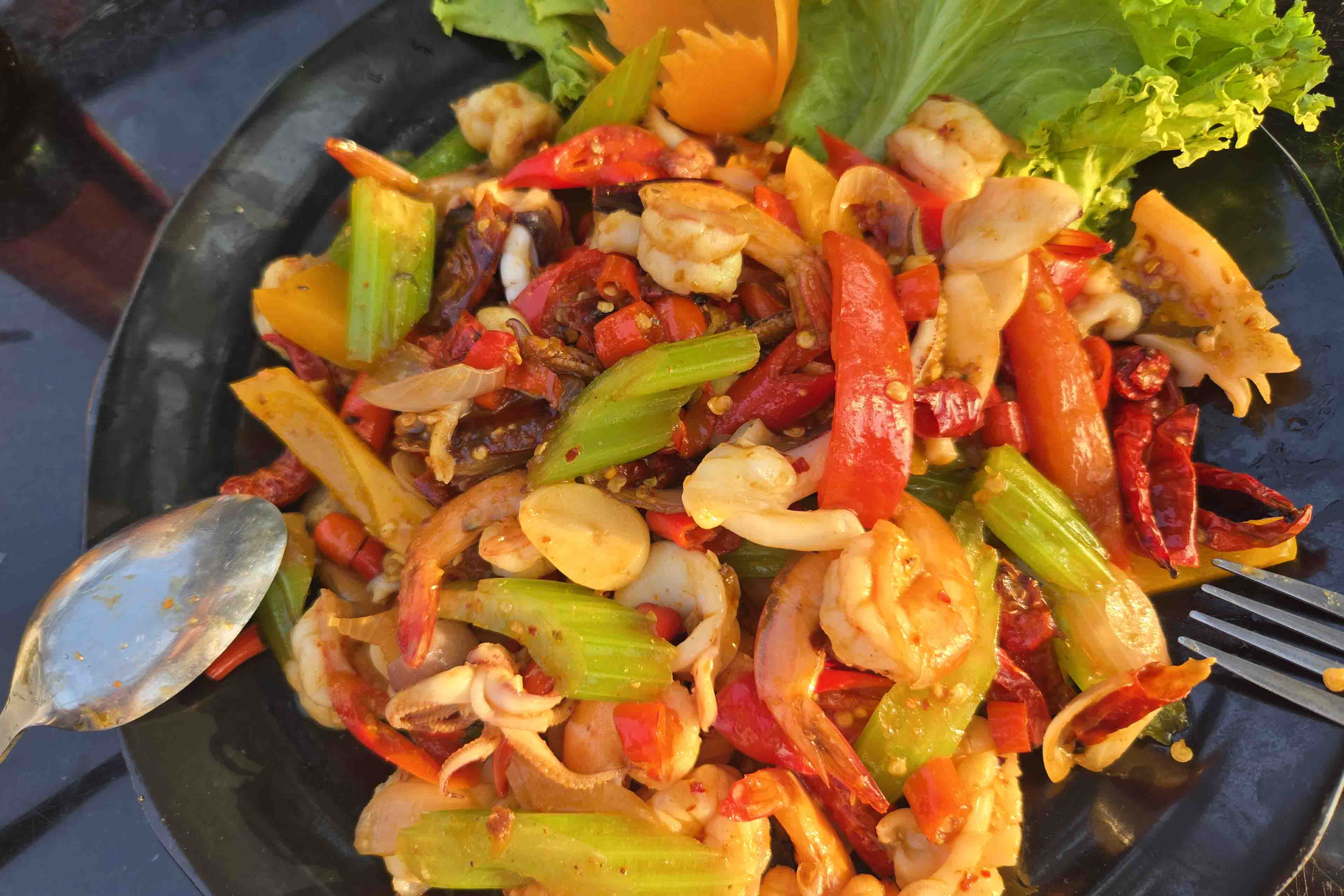 When we got back to Otres Beach, it was still too early to eat, but there were foot massages on offer for $5 and that sounded like a good idea to me. While my feet were being massaged, another lady volunteered to do neck and shoulders, so I had that, too. It was all very nice and relaxing, there by the ocean. If I lived here, I could have it every night. The one doing my feet had enough English to tell me that times were tough now that the Chinese tourists weren’t coming any more, and she blamed COVID. By the time the ladies were done with me, there were a few patrons in the nearby restaurant and I was pretty hungry. I walked about ten feet and up one stair, sat down and ordered a beer. Life was starting to look pretty good. It got better. A very nice young man, from the next table, came over and asked me, in English, if I needed help with the menu. Since it was written entirely in Cambodian characters, I certainly did. There were pictures, mind you, but they didn’t tell you anything about the sauces. I allowed as I could take some spice and actually liked Chili. We ended up ordering this gorgeous dish of shrimp and squid