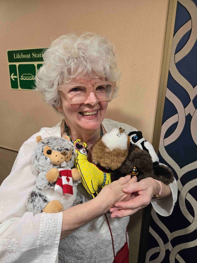 At 4 o’clock there was a block party to usher in the segment. These things are fun. You just bring a wine glass out into your hallway and your stewards pour wine into it and pass hors d’oeuvres. It’s a great way to meet the neighbors. Towards the end, I decked back into my cabin and grabbed the stuffed beaver I had bought for the Wescotts in YUL. They, like me, decorate their cabin with stuffed animals, only more of them. I thought they need a typically Canadian one. So I sauntered through the rest of Deck 3, starboard, with the beaver in the bag from the duty free at YUL. It happens that the lanai cabins midships are full of Canadians, even some Montrealers. I couldn’t resist showing them what I had in the bag. Next thing you know, I had an armload of miscellaneous wildlife in my arms and a bout five cameras pointing my way. It dawned on me that they all wanted a picture with my beaver. And so I said so. And then I realized what I had just said. Sometimes life is like that, so here’s the picture, with my beaver: