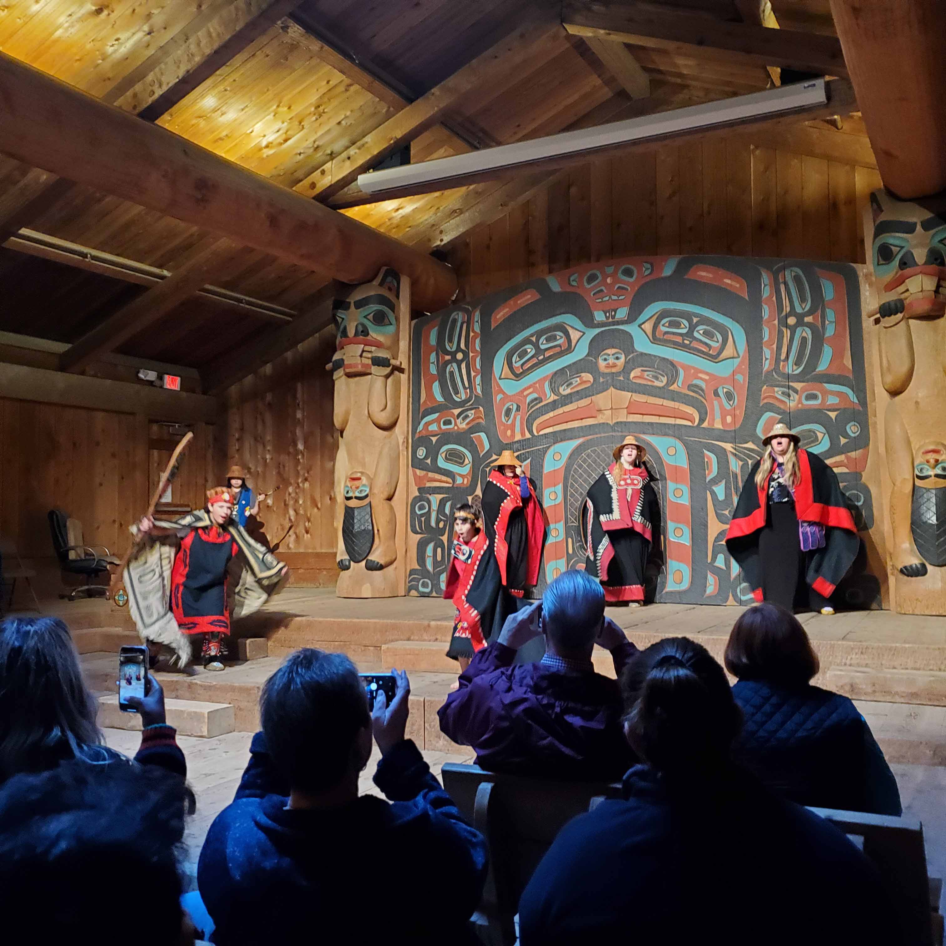 September 14, the day of our shore excursion in Ketchikan, Alaska, came around soon enough and we were up at six. It was a good, punctual group and we were dockside at 8:15am. We were met there and escorted our bus, and our Driver-Guide, Thomas. He looked like a typical Alaskan, a big teddy bear of a guy. Thomas is married to a Tlingit, so he understands the culture. Despite the competition from SilverSea’s free tours, we had a respectable 21 out of 44 on ours. It did not disappoint. First we went to the clan Eagle-Bear house for a traditional ceremonial dance:
