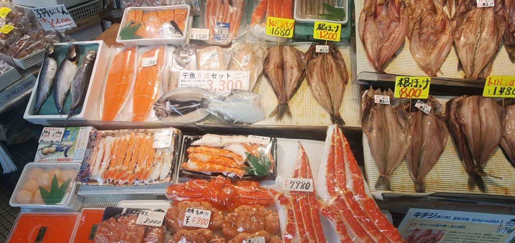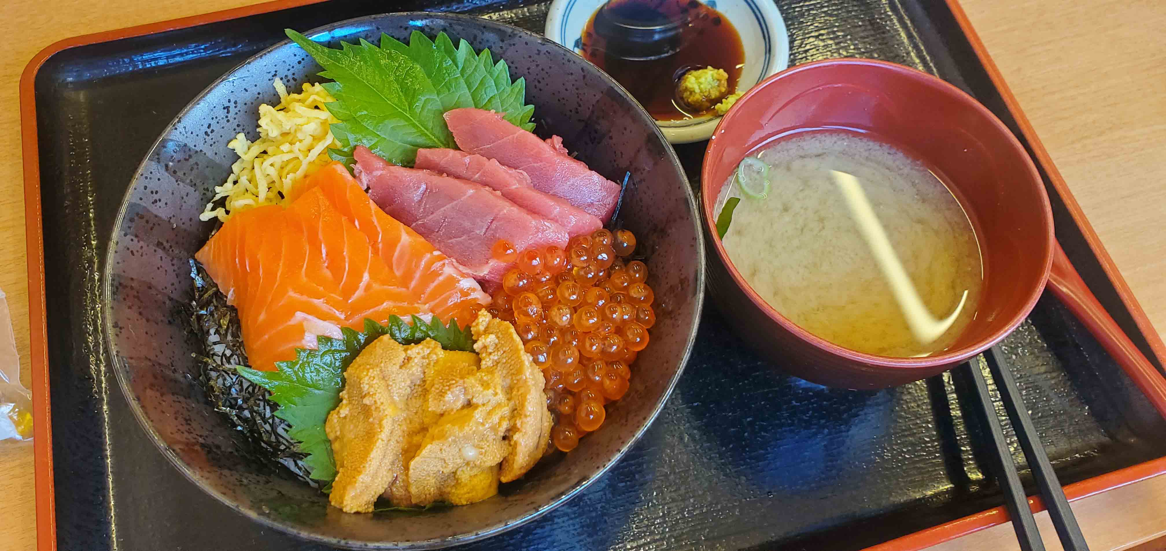 When the guide released us for half an hour, I immediately asked where I could have a bowl of rice with sashimi on it. He led us out of the market to a street facing restaurant on its perimeter, where we were able to get this: