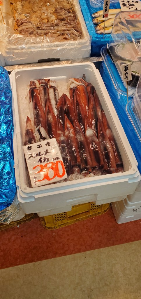 Monday, September 29, we hit the Morning Market, in Miykao, first thing, and I was eating sashimi at 10:30am. Andrea couldn’t face it at that hour. It was a lot more complicated too. There wasn’t time for a sit-down meal. All we could do was buy the treats, in sample sized portions, and eat them as we walked around. If I thought picking up salmon roe was hard, when it had rice under it, it was a lot harder out of a tiny dish. Still perfectly wonderful, though, as was the tuna and squid. Our guide explained that the only squid that should be eaten raw is still brown. Once it has gone white, it’s not good enough.