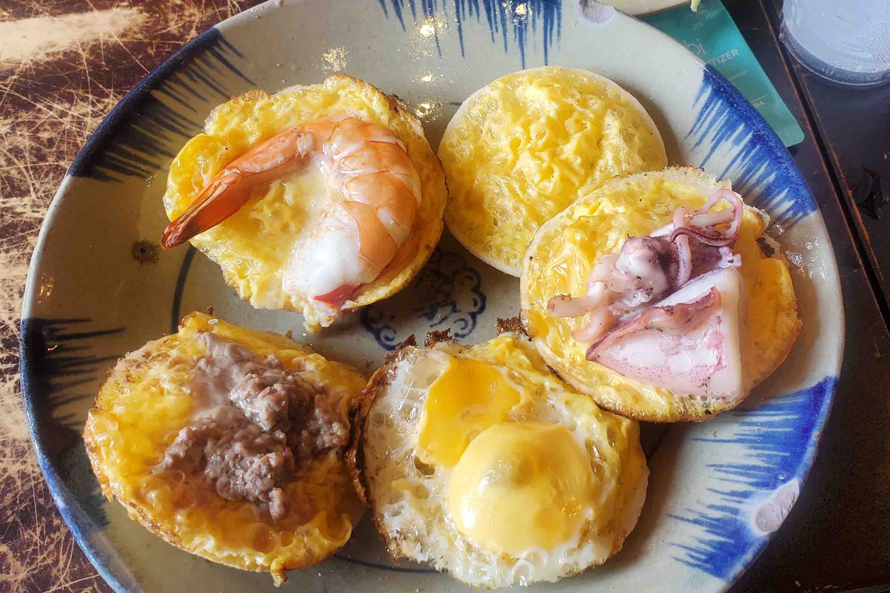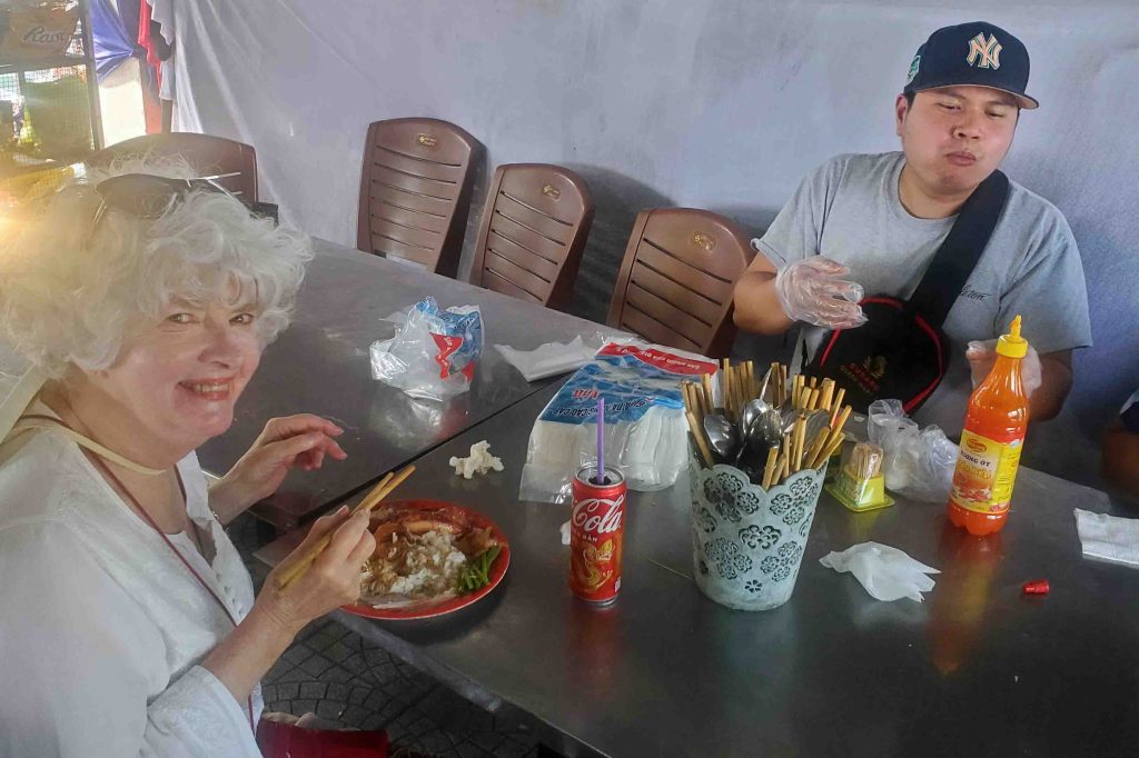 There was not a single passenger in the place. They would be afraid of getting sick. There has been a lot of gastro-intestinal illness going around the ship, but it doesn’t come from squid so fresh that it was alive when you ordered it, and served piping hot, right out of the wok. The crew have no trouble understanding it. Best of all for them, this place had Balut. Now, even I draw the line at Balut. It’s a Philippine delicacy, though, also eaten in Cambodia and Vietnam. Wiipedia says: “A balut is a fertilized bird egg (usually a duck) which is incubated for a period of 14 to 21 days, depending on the local culture, and then steamed. The contents are eaten directly from the shell. Balut that is incubated for longer periods have a well-developed embryo and the features of the duckling are recognizable. The partially developed embryo bones are soft enough to chew and swallow as a whole.” You see what I mean? But check the look on he crew member’s face, while you are checking my fast disappearing plate: