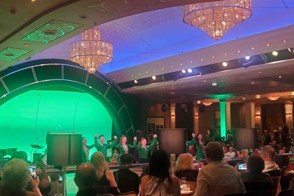 I had dinner with my new friend, Pina, who was born in India but has lived in the states most of her life. We would make good travel buddies. Since we had an early dinner, we caught the early show of “Strings Alive”, a guitar and a violin, leaping all over the stage, like a couple of kids, and they weren’t. But that killed time before the Irish Dance performance in the Queen’s Room. It was SRO when we got there and there were more women standing than men, while seated it was about even. The age of chivalry is long past, apparently. The dance performance was worth standing for, although I have no idea why they couldn’t have put it on the main stage, in a theatre that seats more than a thousand.