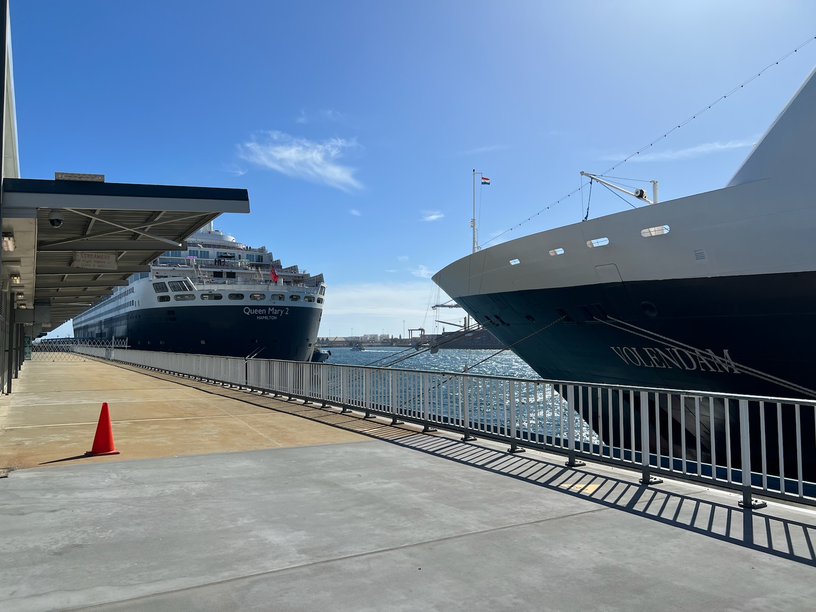 There we sat, enjoying our expertly made cocktails, well attended to and happy. Too soon it was 6:45 and I needed to get back to the ship for 8:00pm all aboard. Of course, that 8:00 pm was an assumption, based on the fact that we were sailing at nine. Had I been on board to read last night’s Daily Programme, I would have known that all aboard was actually 7:30 and when I clocked in on board at 7:32, I was the very last passenger to board.