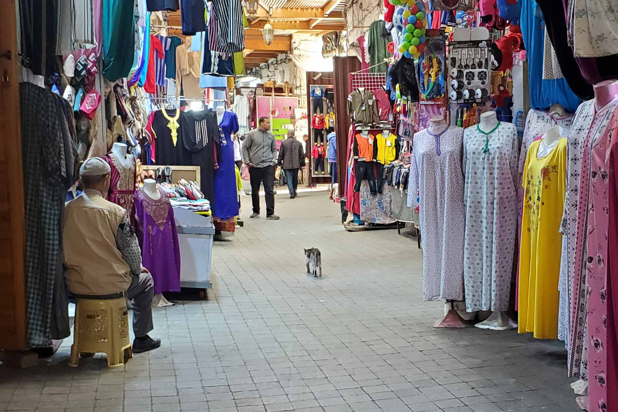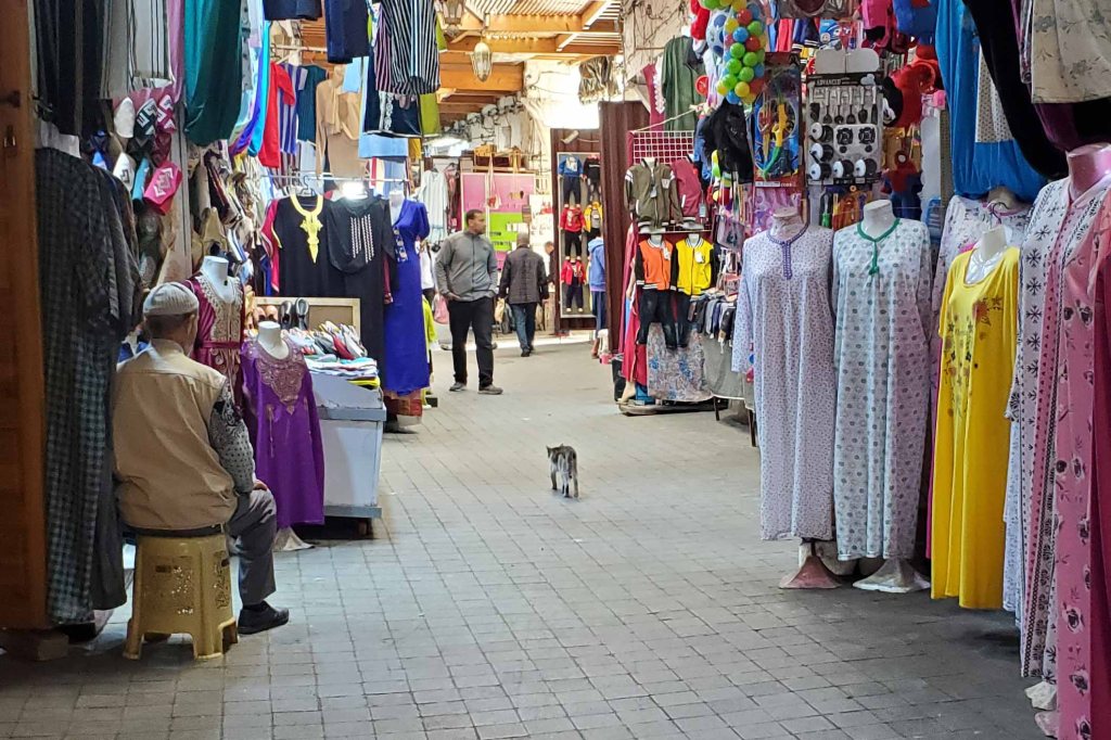 On Thursday, April 6, we docked in Casablanca, Morocco. I delivered my newsletters first thing in the morning and went out with Beryl and Lenora around noon. It took us to the middle of town and Beryl decided to just go back to the ship. Lenora and I were bent on going to the real souk but we couldn’t find it, until one guy told us it was just across the street. That was easier said than done with all the traffic, but there was an underground passage, if you could find it. We asked around and the light rail station attendant finally told us where the rabbit hole was. We took it and popped up in a real souk. Here it is, complete with pussycat.