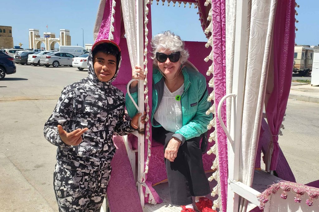 For a change, I had a ship’s tour out of Tangier, Morocco, the next day. We went to Asilah, an old fortified town dating back to the Phoenicians, now a lovely seaside resort. It looks like they overbuilt before COVID and a lot of new condo projects seem to have run out of money. We pit stopped at a restaurant before the walking tour and I happened to spot three of four calèches waiting for fares. I was still in a mood to baby my right knee and left ankle and found a willing partner named Nancy. It was only going to be $10 each for a 35 minute horse and buggy ride around the city. Of course, we saw the modern city, rather than the refurbished old one, which was closed to all but foot traffic. No matter. It was easy on our legs and a lot of fun. There was no live entertainment again, so I got to bed early.