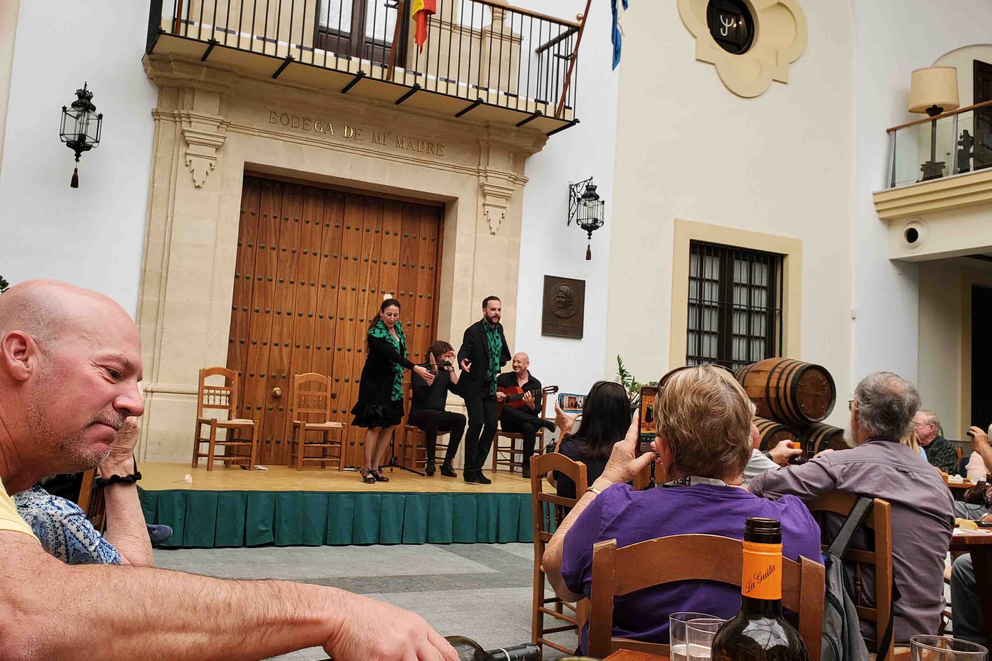Once we had received our education on the making of fortified wines, we gathered in a very large room for wine, tapas, and flamenco. What was not to like? The dancers were great, the wine flowed freely, and we missed seeing the horses on the way out because so many people were buying wine. They gave me a free bottle and I added two to it. I’ll be serving them at our farewell dinner.