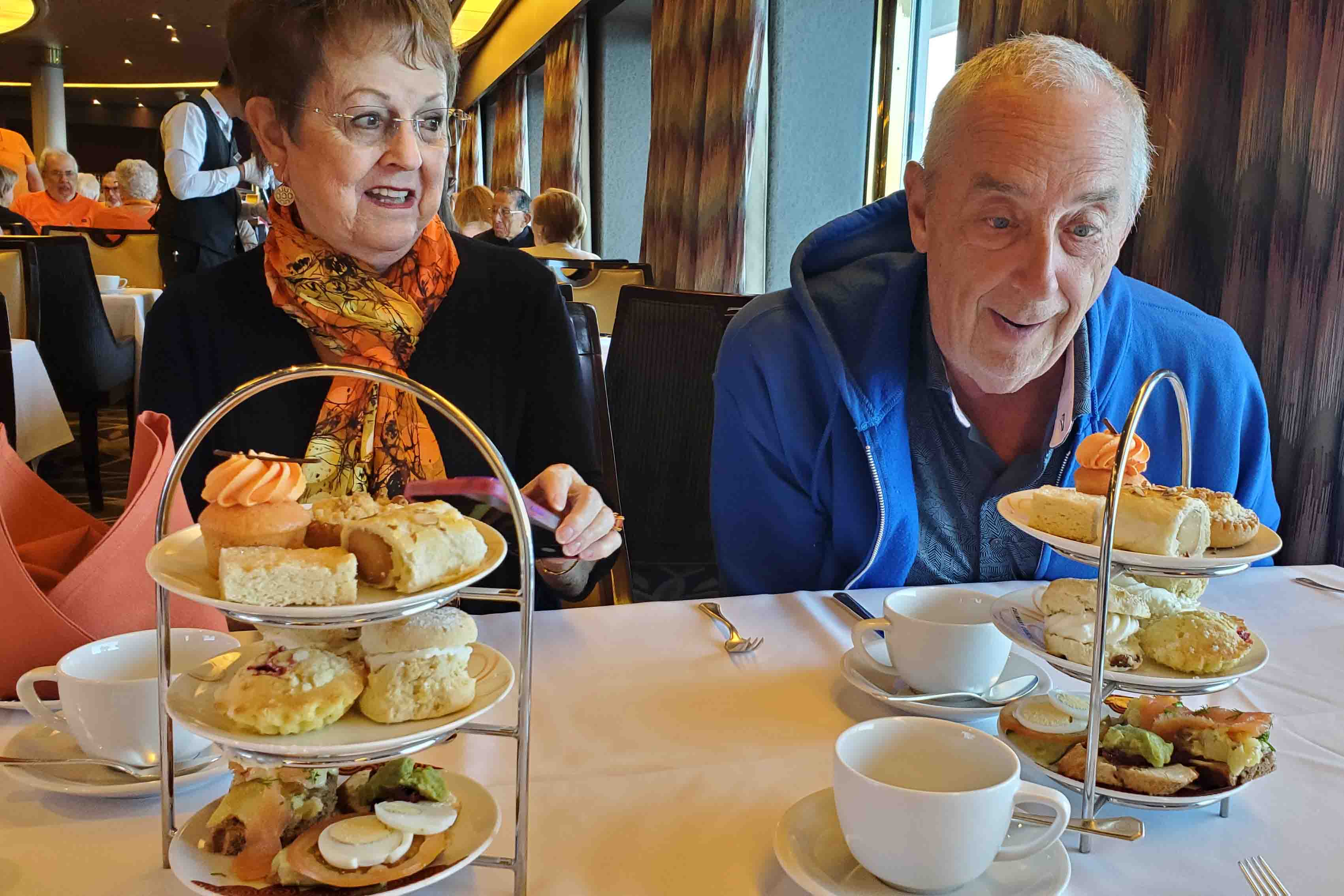 Uffe & Joan Folkmann joined Nona and Me on board for breakfast today. I had to have ONE dining room breakfast and this was a good occasion. Uffe was our guide for Mariann’s tour of Denmark last year. He’s such a nice person and so is his wife, Joan, who joined us for the last day, last year. They were not unfamiliar with cruise ships. It’s one of their favorite ways to have a vacation. I get it.