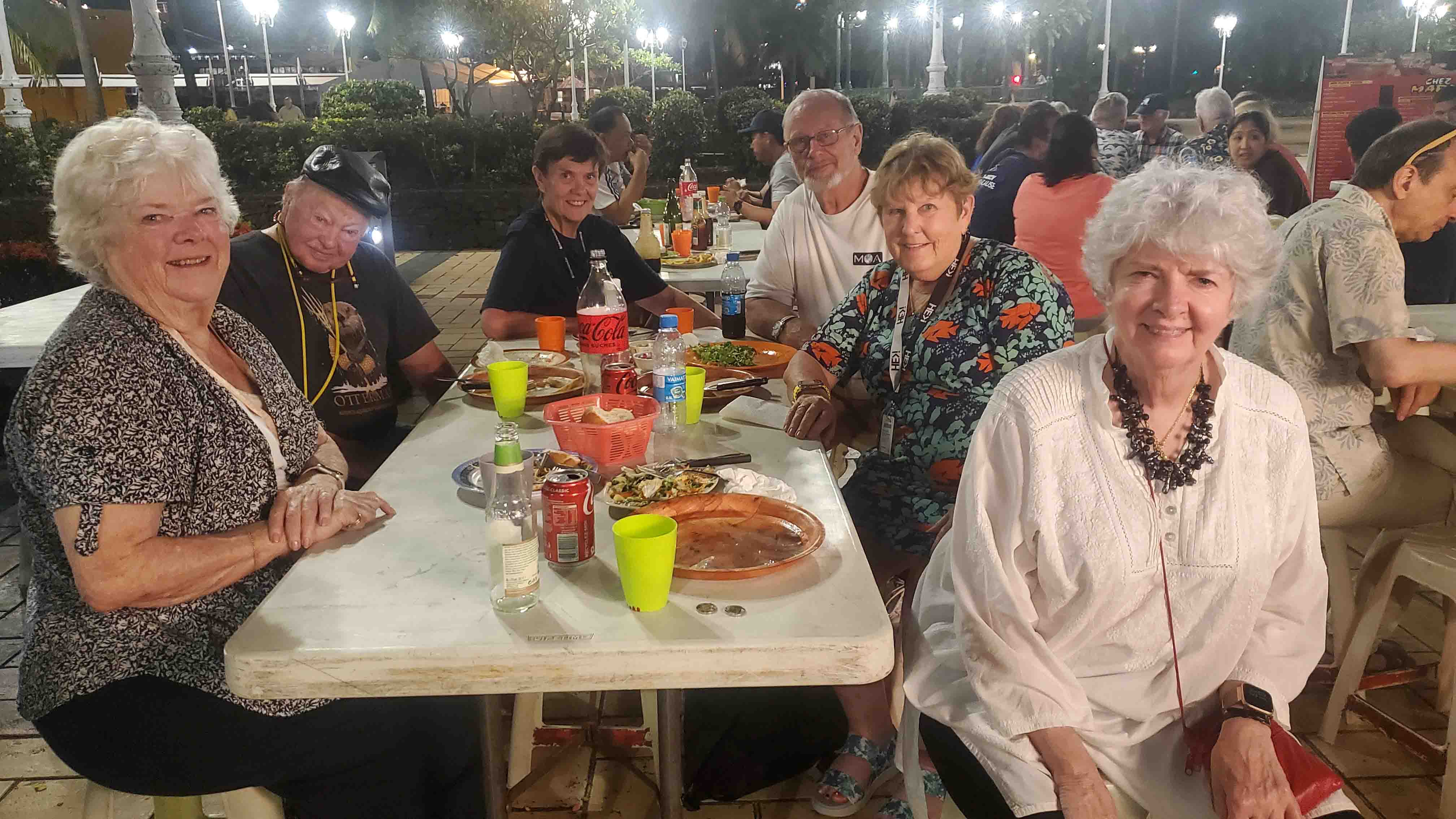 Back on board I dealt with my messages, wrote a bit, and soon it was time to go out to the food trucks, always an event in Papeete. There are a lot less of them than there used to be, COVID casualties here, too. We went out early though and here is our dinner table, transplanted from the Zuiderdam.
