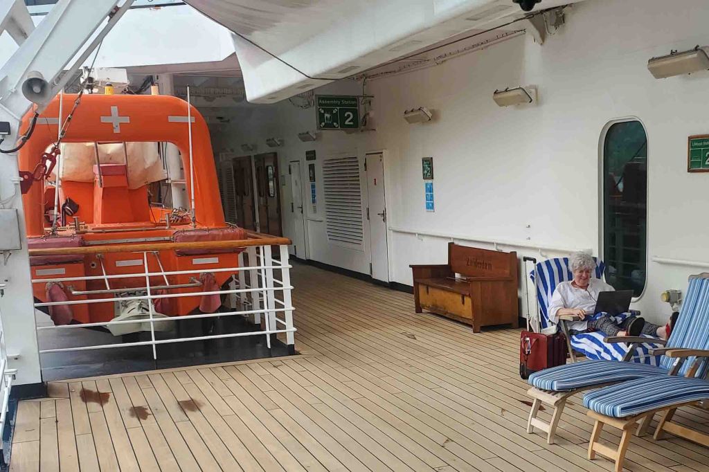I was done in time for sailaway, but by the time I went to my room, stowed the computer, put on some sunscreen and got up to the Lido, aft, it was starting to sprinkle. One of my couples had a little table against the wall with a bit of shelter, and I stayed with them, flattened against the wall in what turned out to be a real squall. When it rains here, it pours. Then it’s over, but it sure breaks up the party.