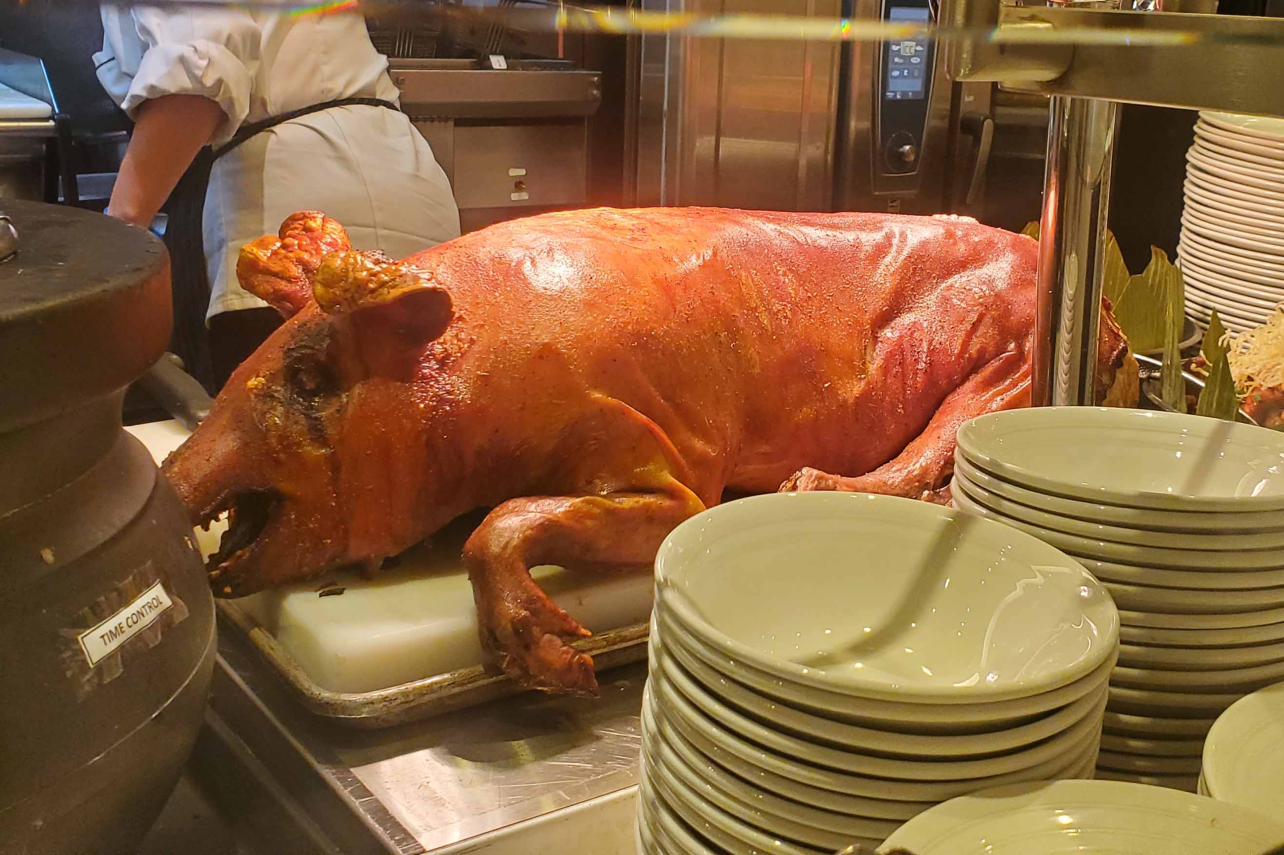 It was Chinese New Year’s Eve and Holland America decided to welcome in the year of the rabbit with a whole suckling pig at the Lido Buffet. He was gorgeous. I met Doris Reeves and the two of us bonded over suckling pig appetizers with roast duck pancakes.